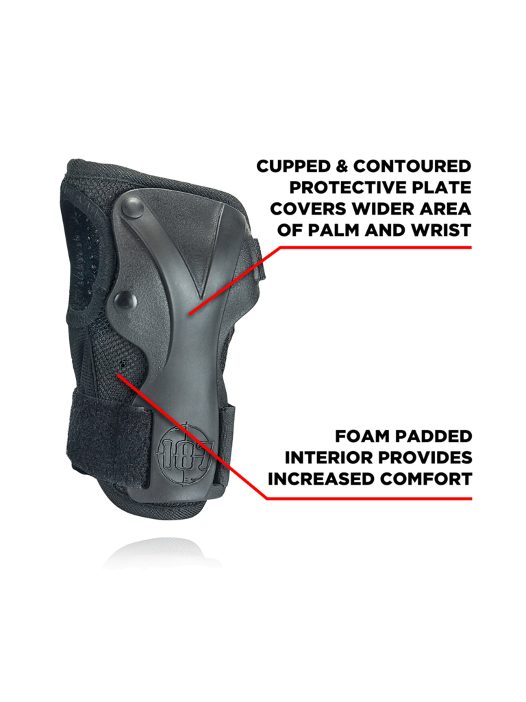 - Cupped and contoured protective plate covers wider area of palm and wrist