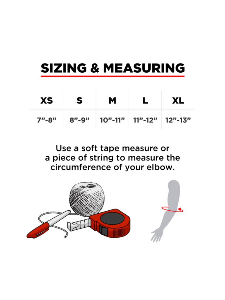 Sizing: (To ensure a perfect elbow pad fit, measure circumference of extended elbow and match to the sizes listed below)