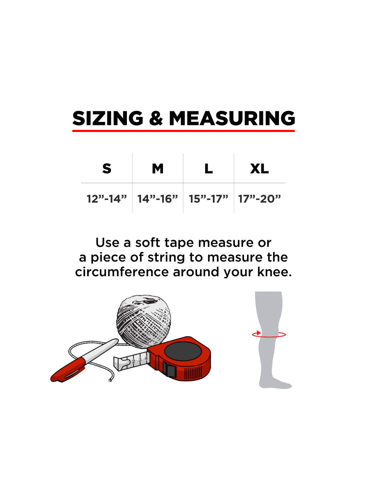 Sizing: (To ensure a perfect knee pad fit, measure circumference of extended knee and match to the sizes listed below)