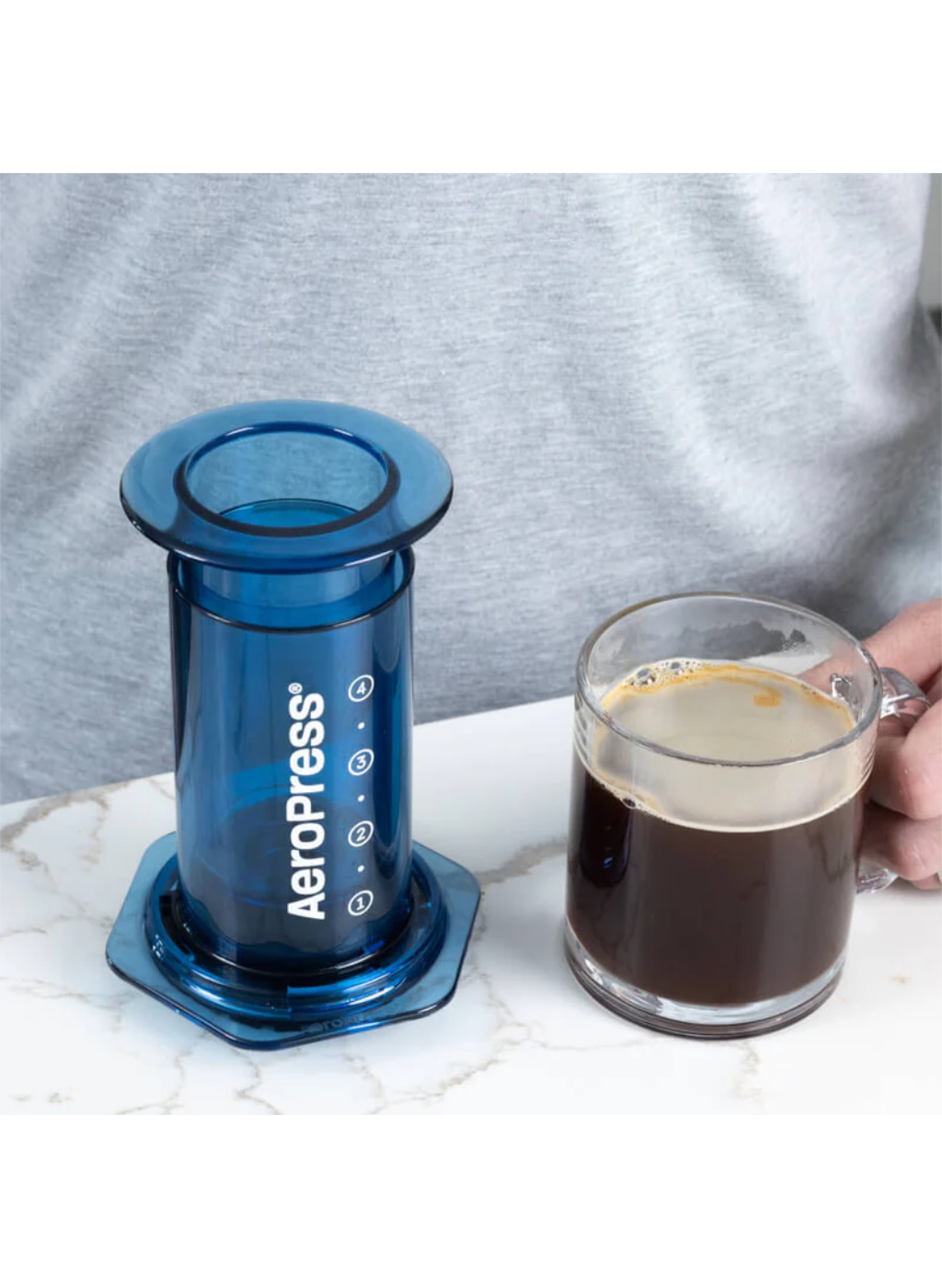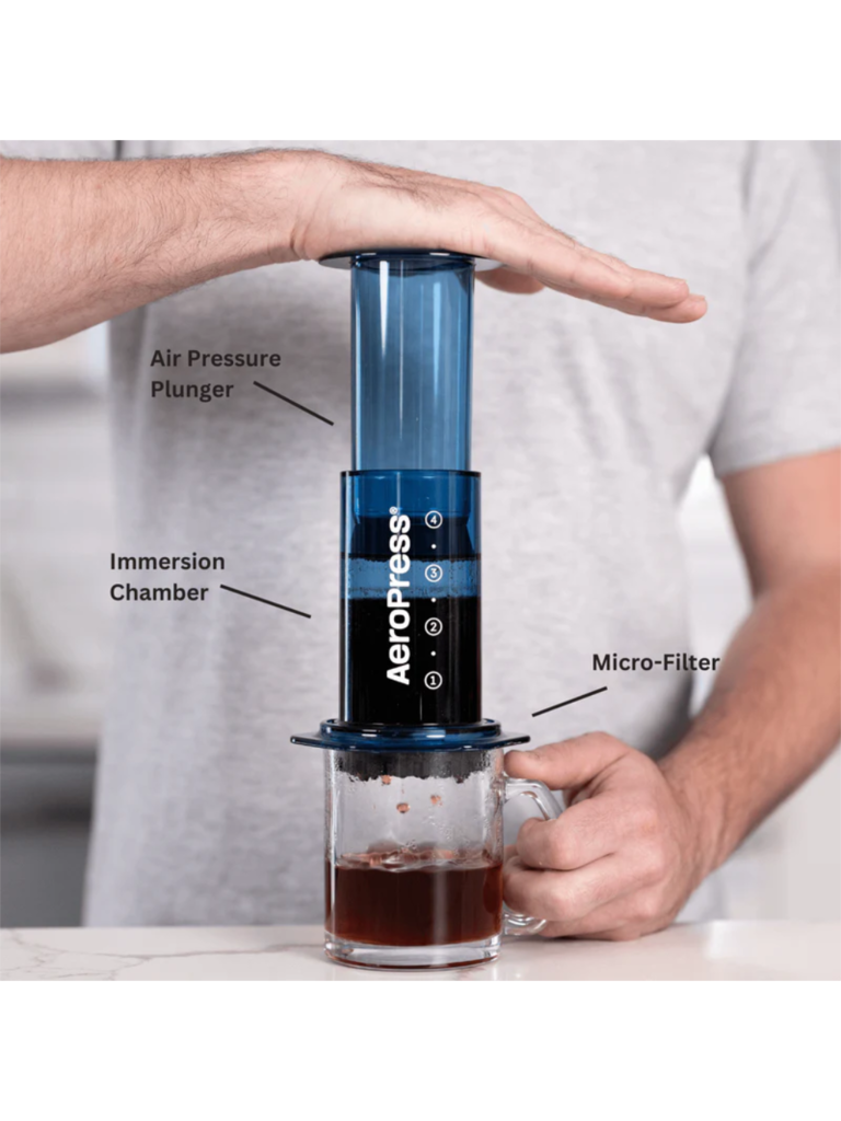 First, water is poured over the coffee, wetting and aerating the grinds, creating the signature AeroPress smoothness. Then, during the immersion process, water penetrates the coffee grinds for deeper flavor notes and a full bodied finish often found in a French Press. Finally, the magic happens - air pressure quickly pushes the brew through the coffee bed and filter, removing grit and bitter tasting oils for an espresso-like richness