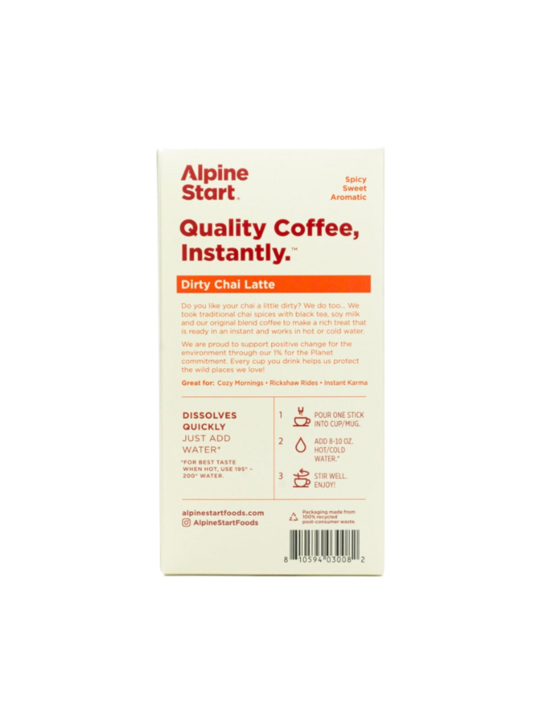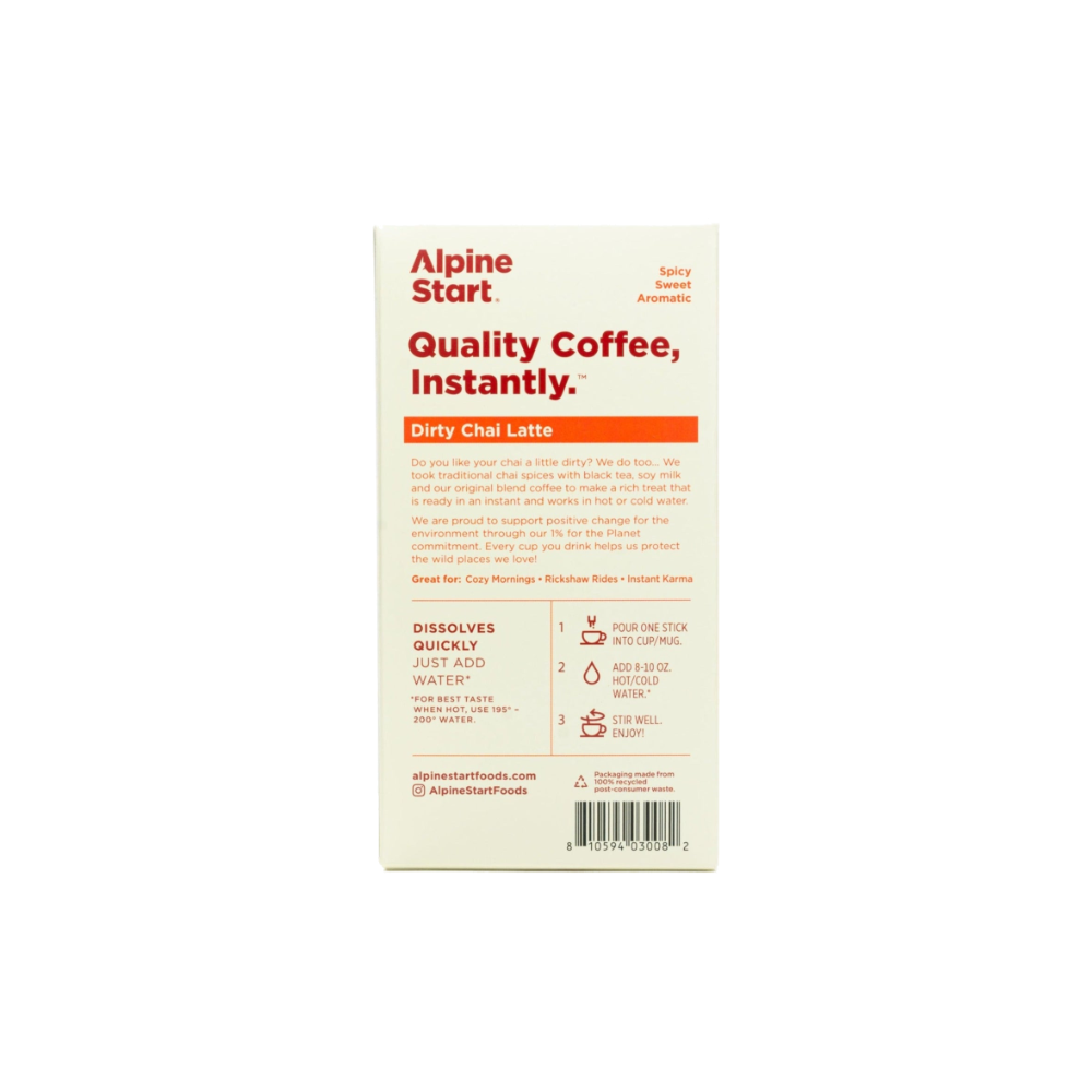 Create an accountInspired by world travels, we’ve brewed all the spiced, bold, and creamy flavor of the best 100% Colombian Arabica coffee, traditional chai spices, black tea, and soy milk into an instant dirty chai latte mix.