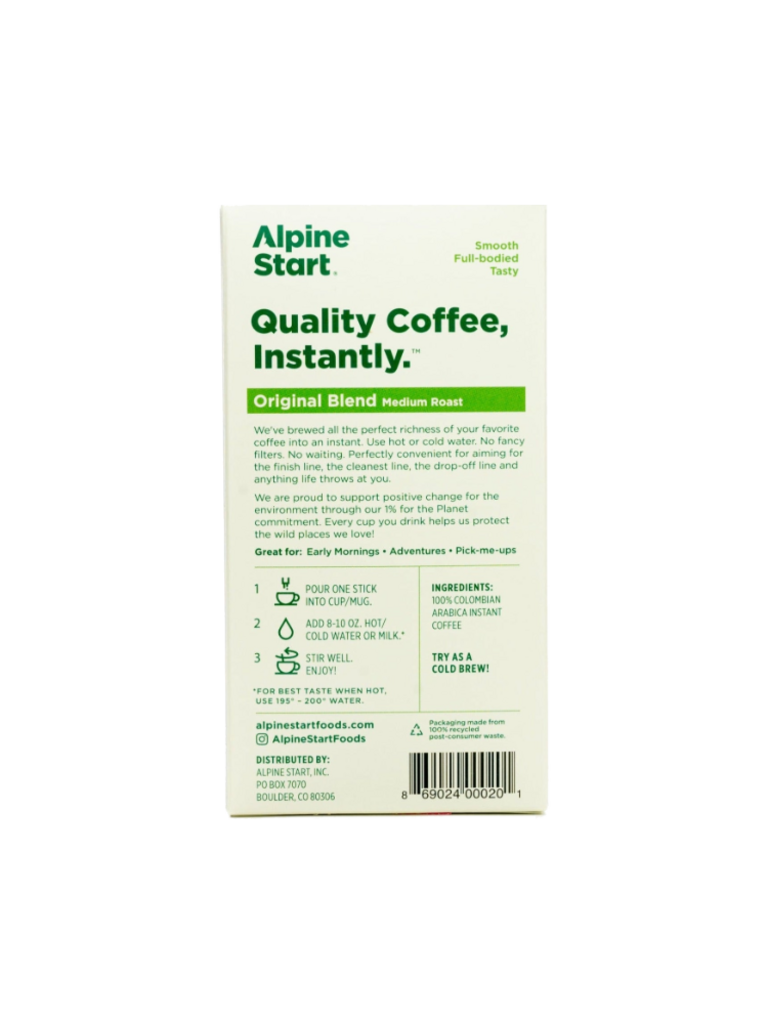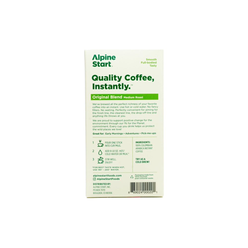 Create an accountAfter years of searching for a tasty, instant coffee that you actually want to take backpacking or on-the-go, Alpine Start decided to make their own. They’ve brewed all the smooth, rich, and full-bodied flavor of the best 100% Colombian Arabica coffee beans into an instant.