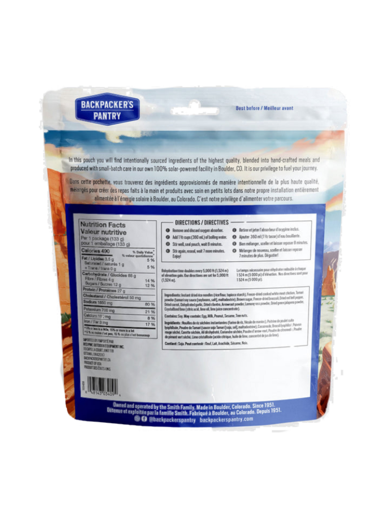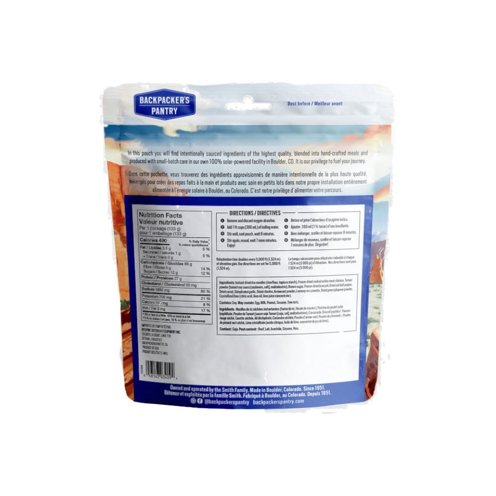 Instant Dried Rice Noodles (Rice Flour, Tapioca Starch), Freeze-dried Cooked White Meat Chicken, Tamari Powder (Tamari Soy Sauce (Soybeans, Salt), Maltodextrin), Brown Sugar, Freeze-dried Broccoli, Dried Red Bell Pepper, Dried Carrot, Dehydrated Garlic, Dried Cilantro, Arrowroot Powder, Lemongrass Powder, Dried Green Jalapeno Powder, Crystallized Lime (Citric Acid, Lime Oil, Lime Juice Concentrate).