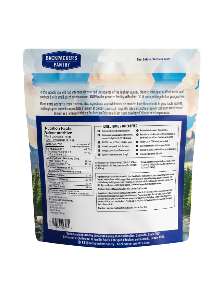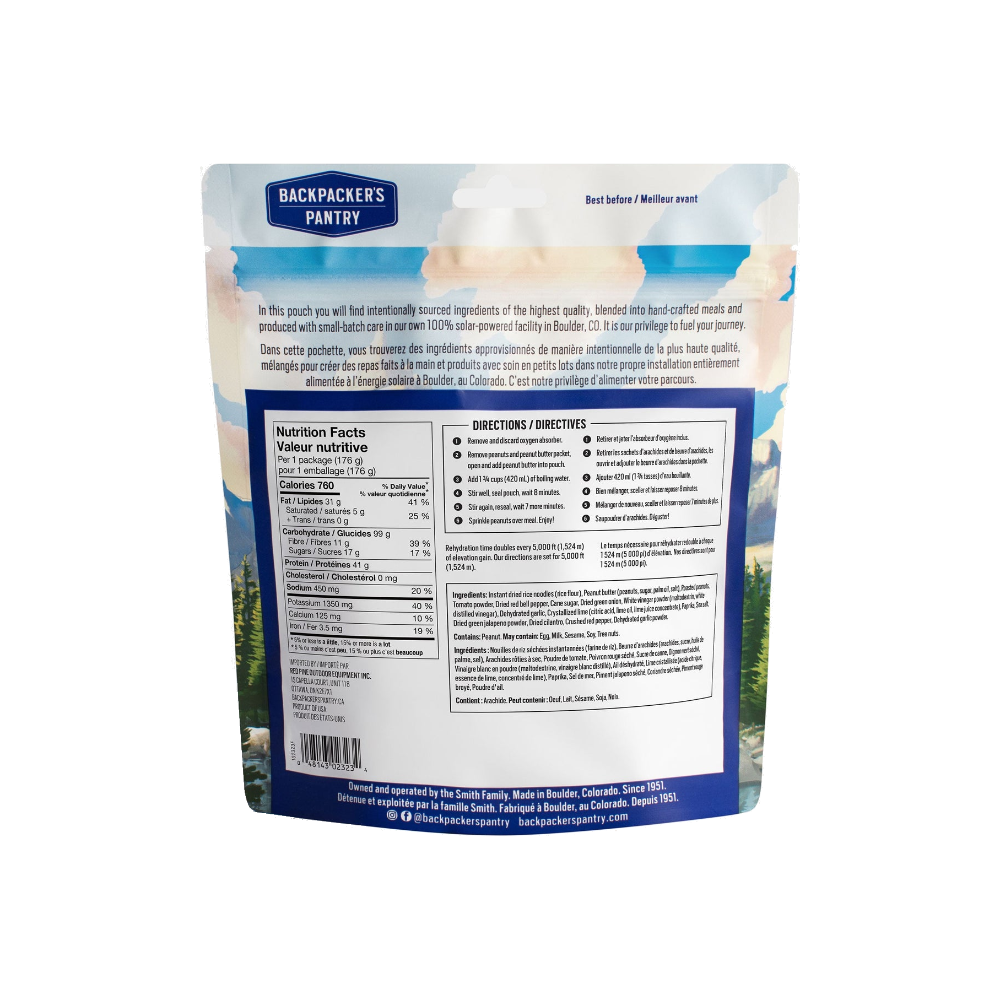 RICE NOODLE (RICE FLOUR AND WATER), SAUCE (TOMATO POWDER (TOMATO, 1% SILICON DIOXIDE), ORGANIC CANE SUGAR, WHITE VINEGAR (MALTODEXTRIN AND WHITE DISTILLED VINEGAR), SAVORY SOUP BASE (MALTODEXTRIN, SALT, AUTOLYZED YEAST EXTRACT, YEAST EXTRACT, ONION POWDER, SILICON DIOXIDE, TURMERIC EXTRACT (COLOR), SUNFLOWER OIL), GARLIC, NON-GMO CRYSTALLIZED LIME (CITRIC ACID, LIME OIL, LIME JUICE), CILANTRO, CRUSHED RED CHILI PEPPER, SEA SALT), ORGANIC TEXTURED SOY PROTEIN, PEANUT BUTTER (PEANUTS, CANE SUGAR, PALM FRUIT OIL (CERTIFIED SUSTAINABLE), SALT), DRY ROASTED PEANUTS, RED BELL PEPPER, SRIRACHA POWDER (NON GMO PURE CANE SUGAR, PAPRIKA, WHITE VINEGAR (MALTODEXTRIN AND WHITE DISTILLED VINEGAR), TOMATO POWDER (TOMATO, 1% SILICON DIOXIDE), JALAPENO CHILI PEPPER, GARLIC, SEA SALT), GREEN ONION, NON-GMO CRYSTALLIZED LIME (CITRIC ACID, LIME OIL, LIME JUICE).