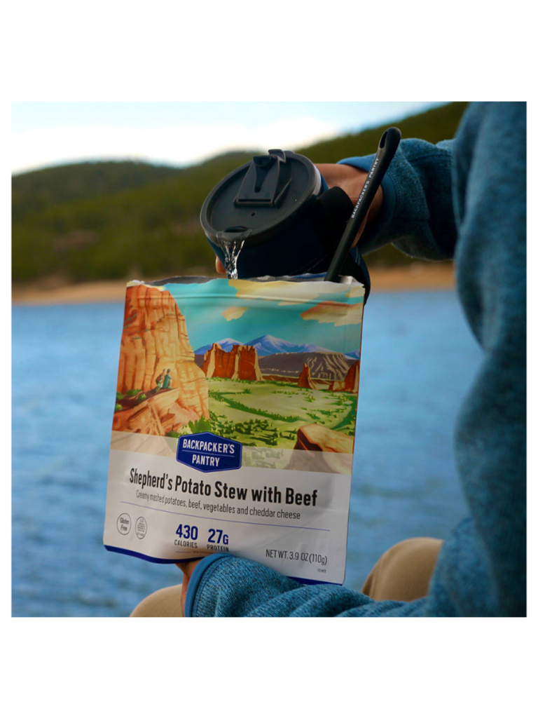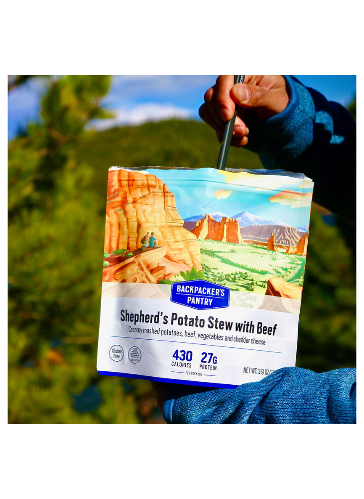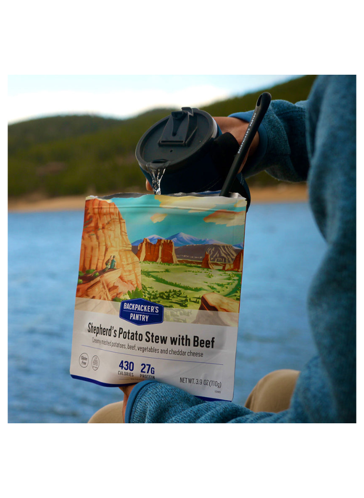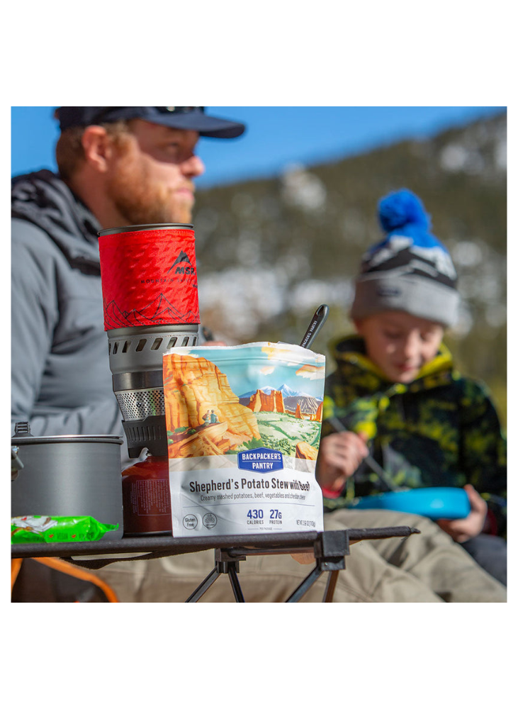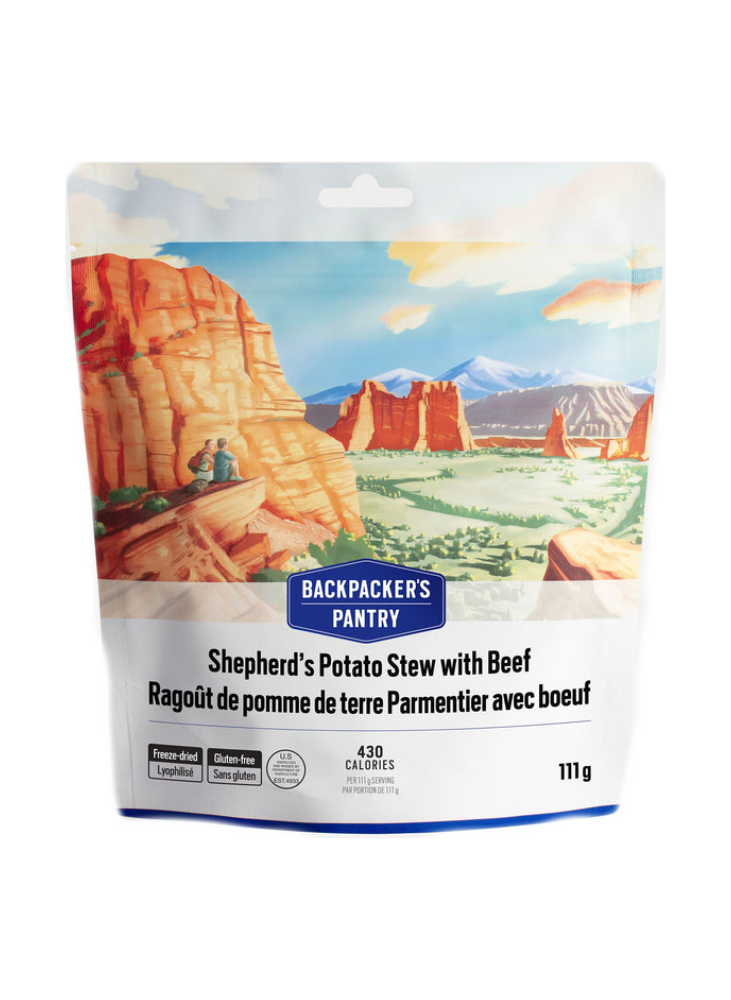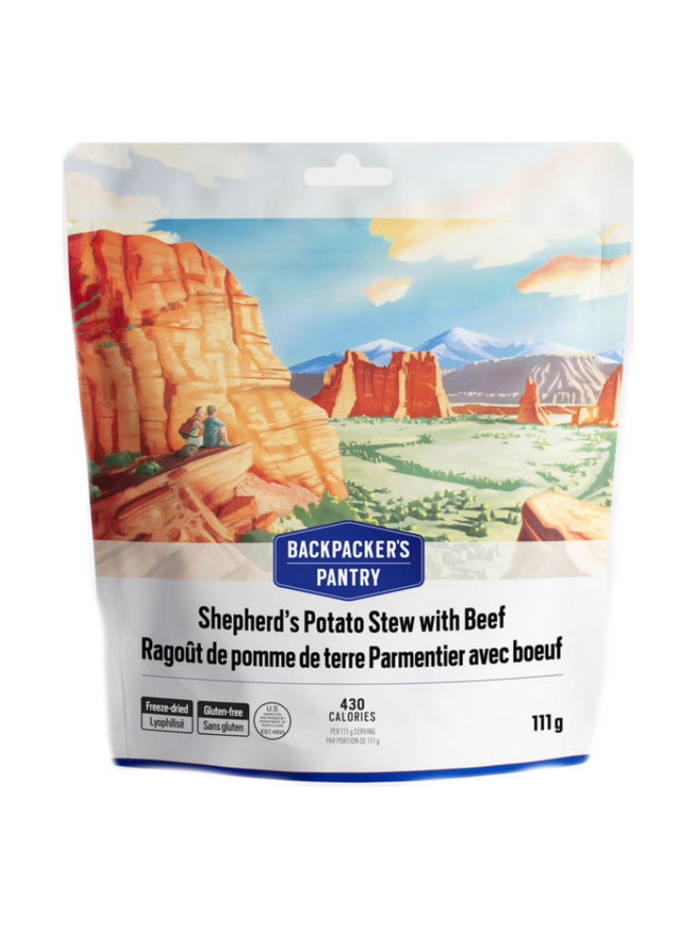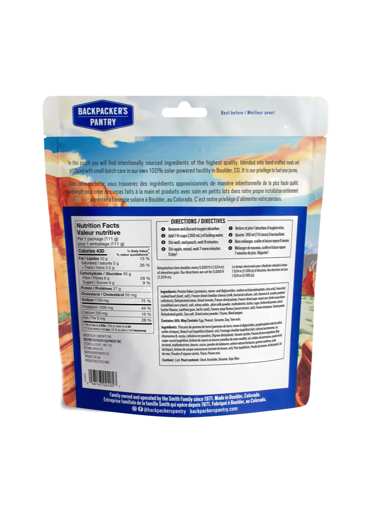 Potato Flakes (potatoes, mono- and diglycerides, sodium acid pyrophosphate, citric acid), Freeze-dried Cooked Beef (beef, salt), Freeze-dried Cheddar Cheese (milk, bacterial cultures, salt, chymosin B, annatto, powdered cellulose), Dehydrated Onion, Dried Tomato, Freeze-dried Potato, Freeze-dried Super Sweet Corn, Butter Sauce Flavour (modified corn starch, salt, whey solids, skim milk powder, maltodextrin, butter, sugar, buttermilk powder, natural butter flavour, xanthan gum, lactic acid), Savory Soup Flavour (yeast extract, salt), Freeze-dried Peas, Tomato Powder, Dehydrated Garlic, Sea Salt, Dried Onion Powder, Thyme, Black Pepper.