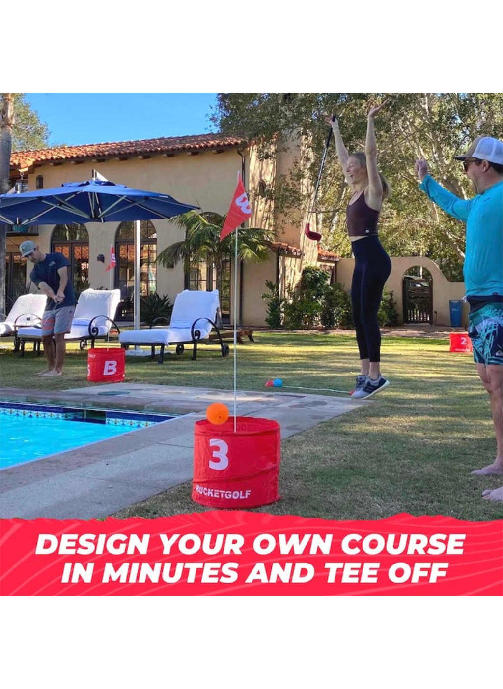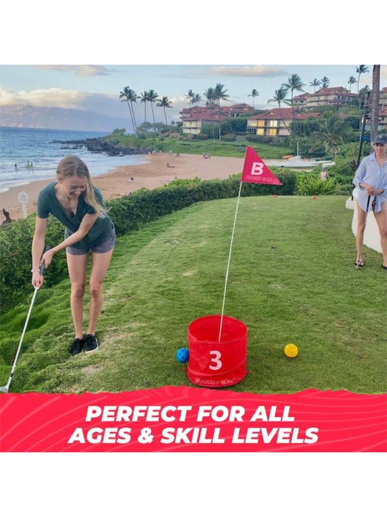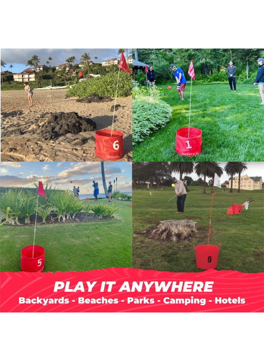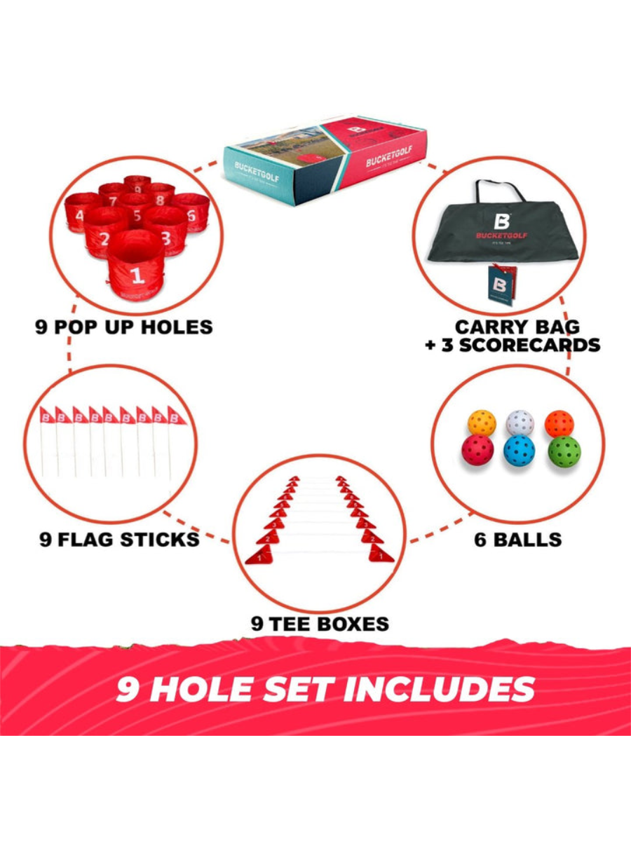 Includes: 9 Pop up Holes, 9 Flag Sticks, 9 Tee Boxes, 6 Balls, 1 Carry bag and 3 Scorecards.