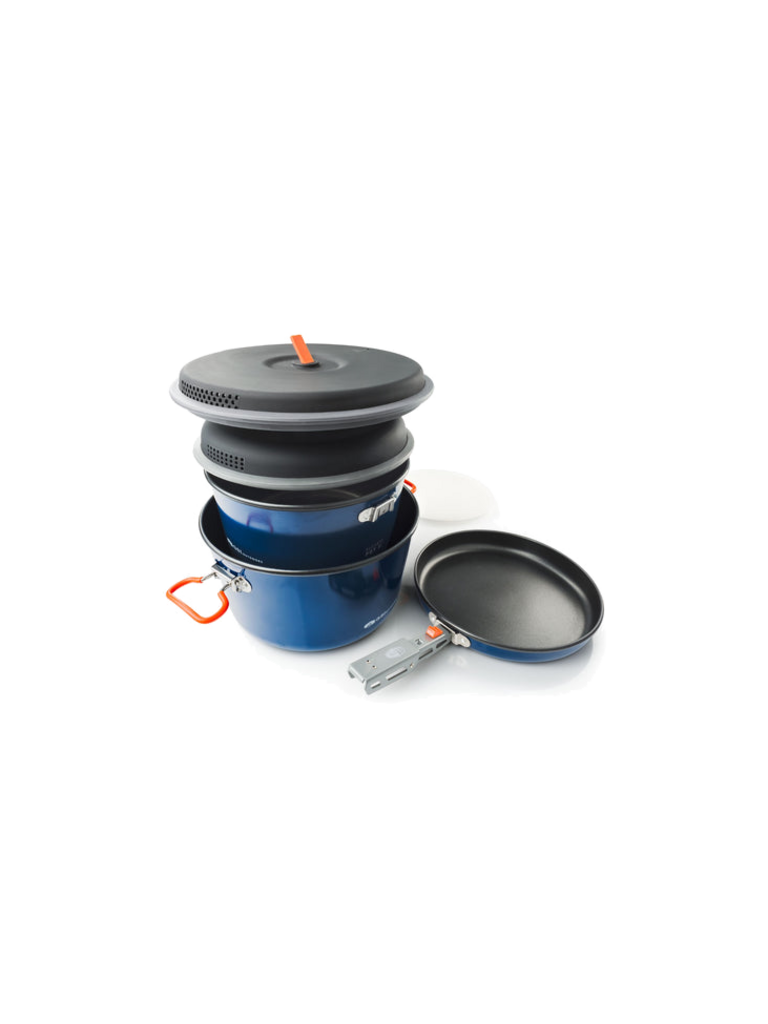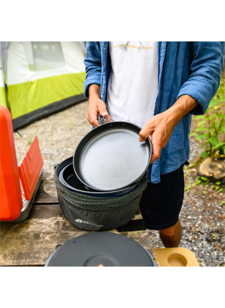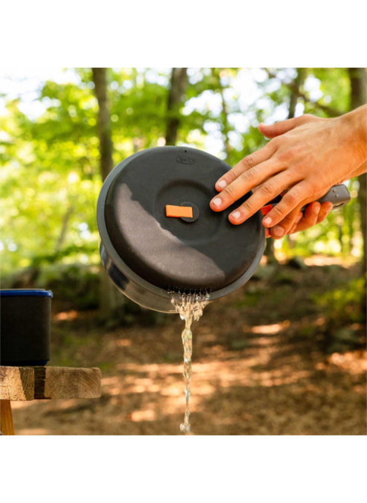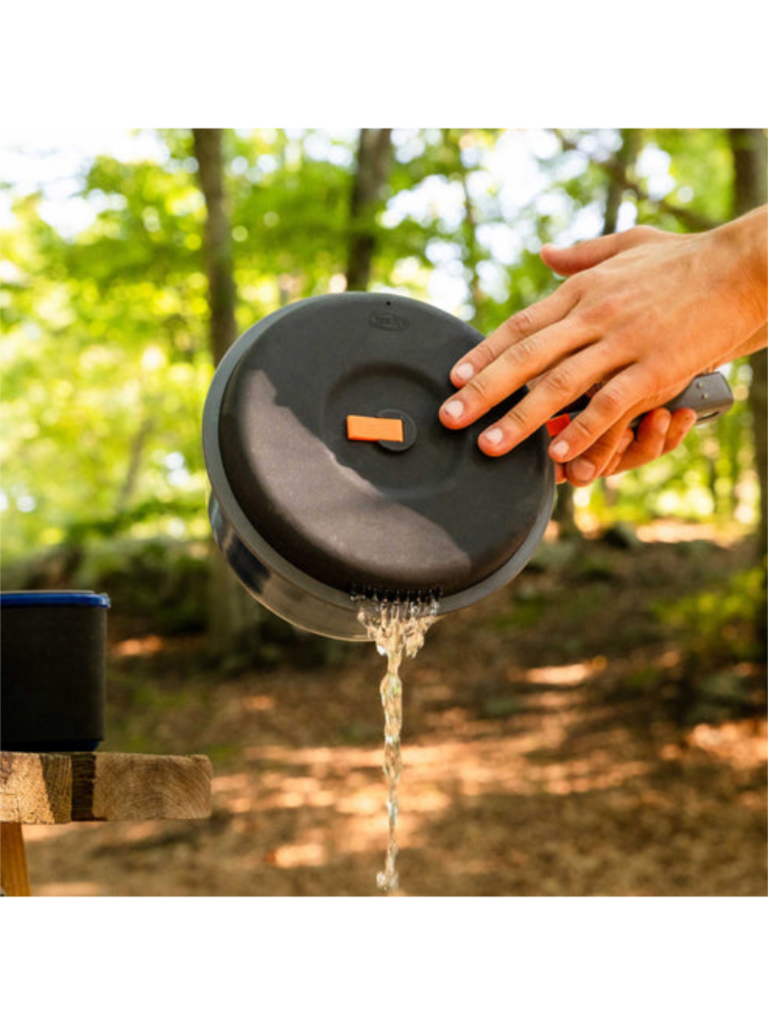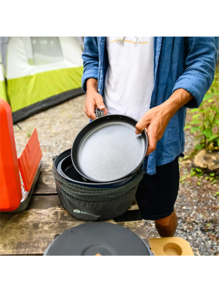 Create an accountThe pot and lid combo are perfect for stovetop use. Every set includes a 2 pots, a frypan, 2 nylon strainer lids, a dished cutting board for a variety of prep duties, a folding pot handle, and a welded stuff sack to keep everything organized and doubles as a sink for washing. Features a crush-proof, heat-resistant strainer lid.