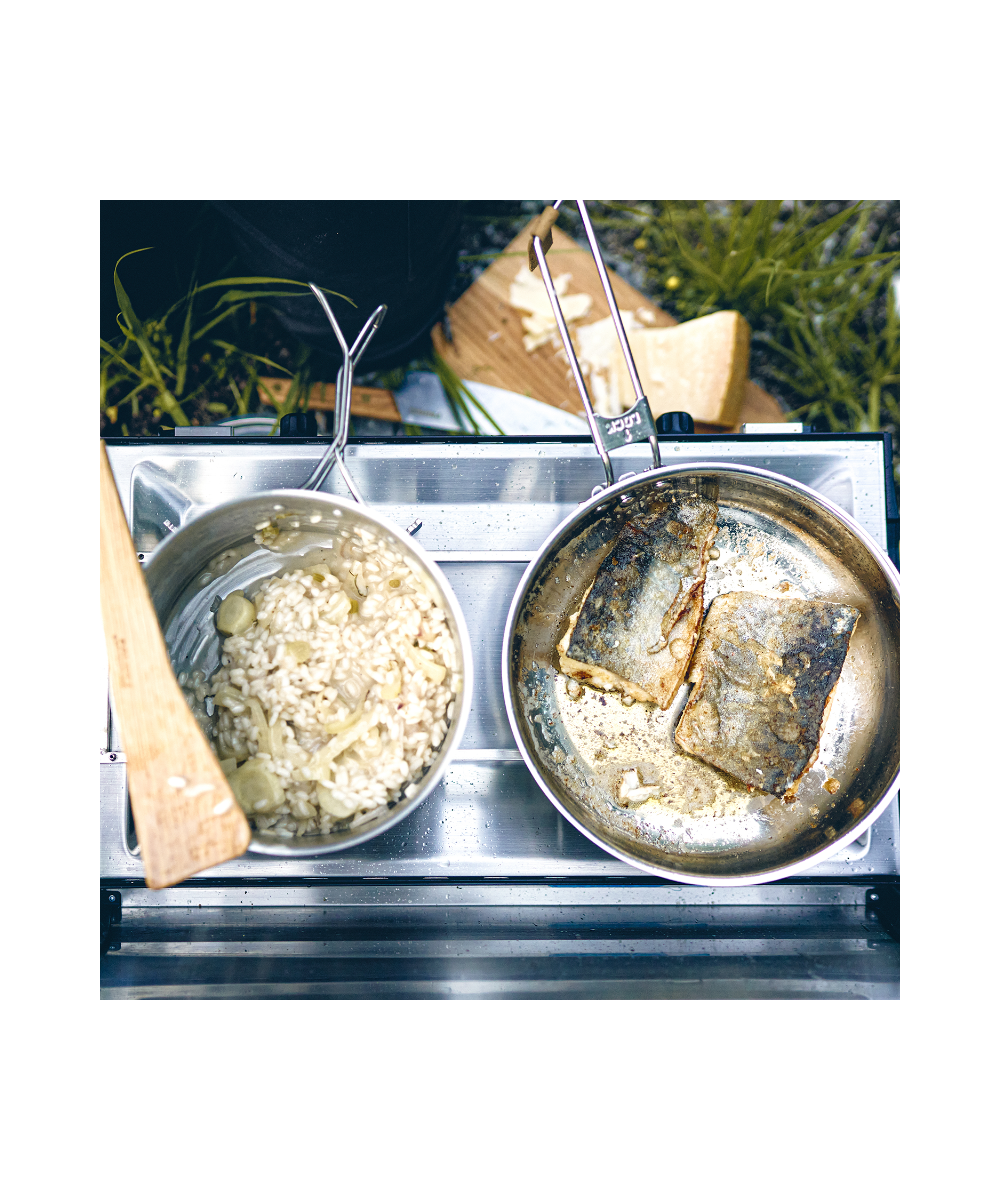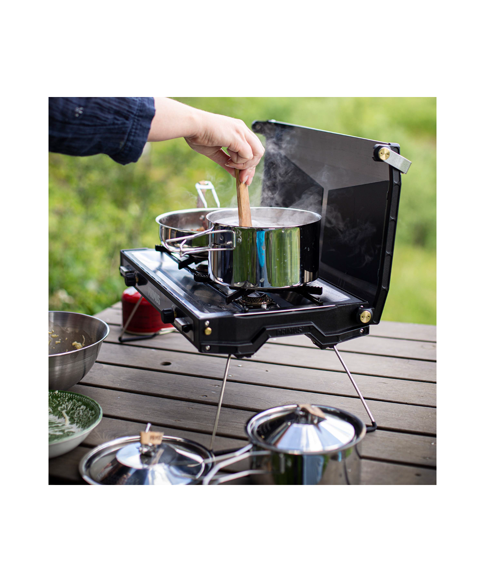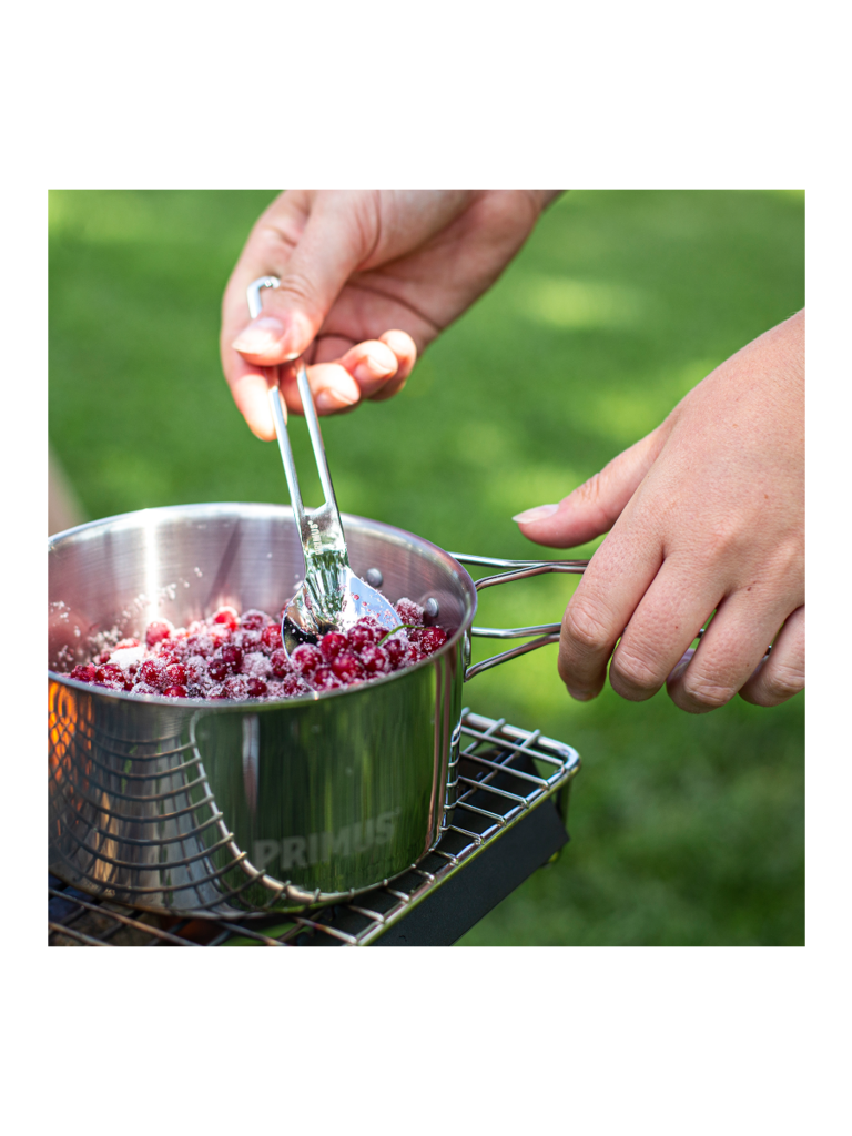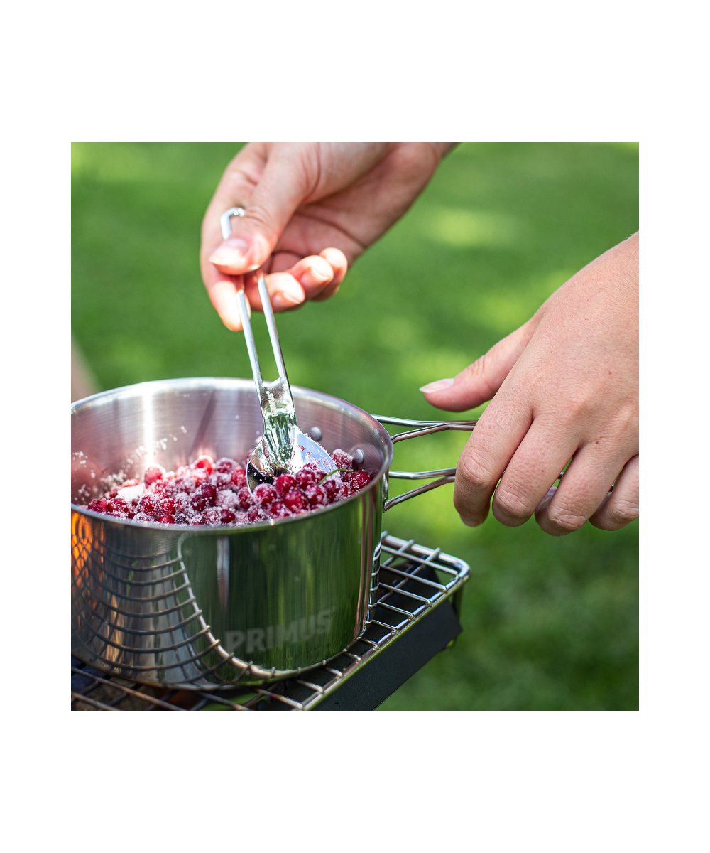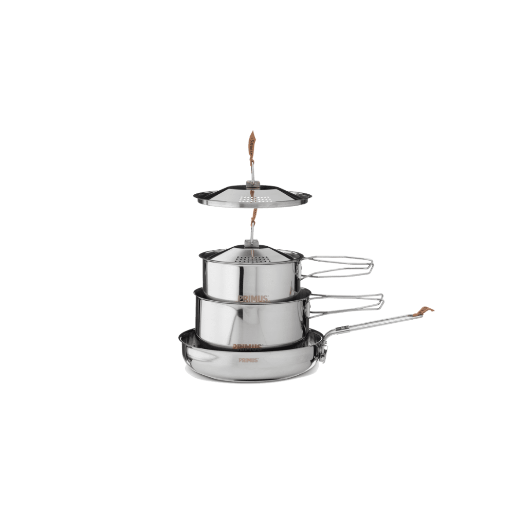 Create an accountDurable 18/8 stainless steel Primus cookset - a genuine workhorse designed to withstand years and years of service. The set consists of two pots (1,0 and 1,8 L), two lids with integrated colanders and a frying pan. The frying pan has a foldaway handle and aluminium-clad bottom for even heat distribution. The pots are stackable and packs compactly together with the frying pan into an included storage bag.