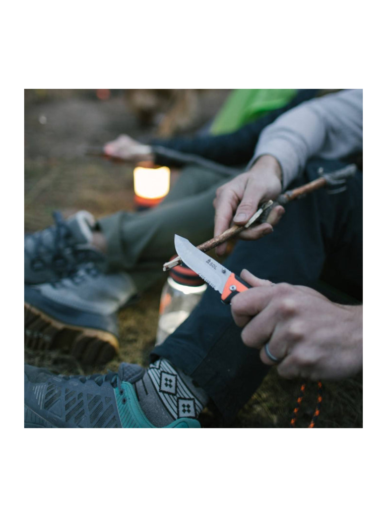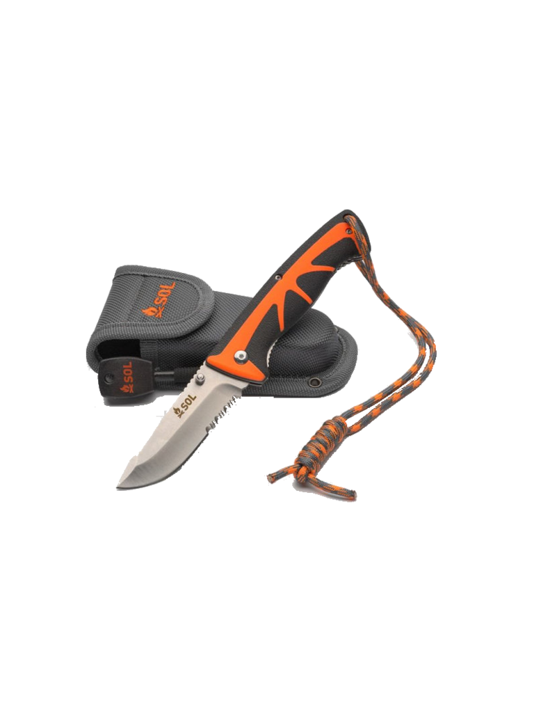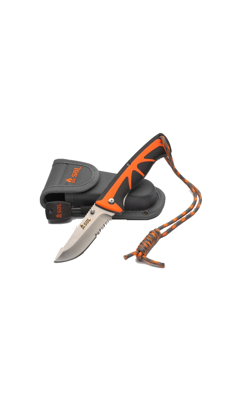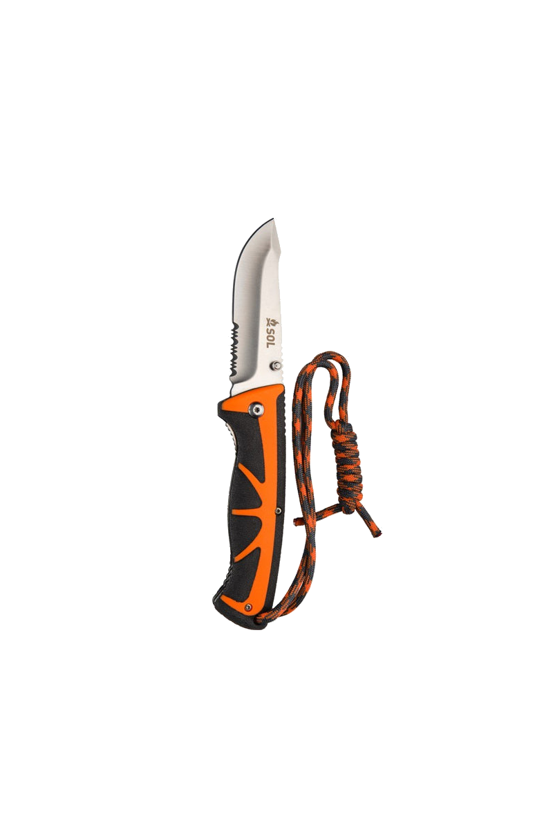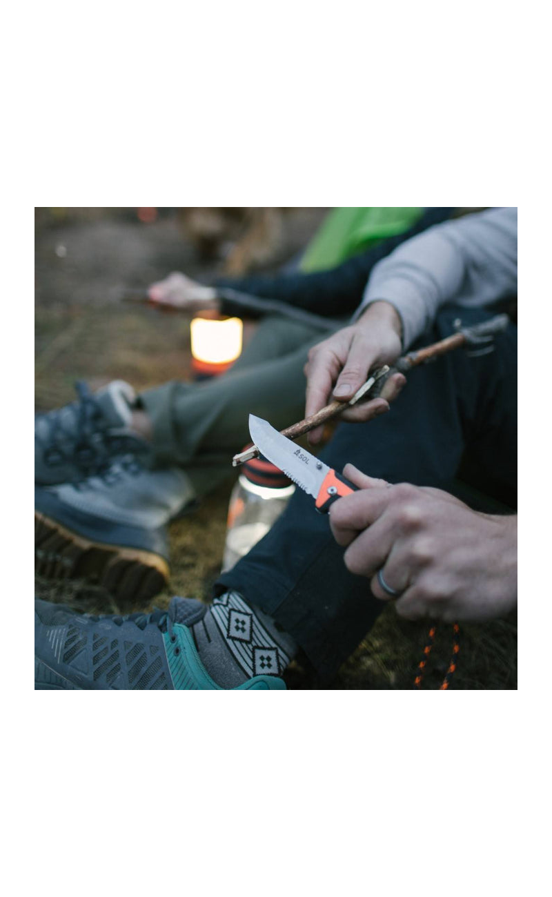 Create an accountThe Stoke Folding Knife features a high-grade satin-finished 420 stainless steel 3.25-inch blade, which folds down into an ergonomic non-slip PP/TPR handle with a secure liner lock. Use the serrated rope cutter at the base of the blade to cut a piece of tinder cord and light with the full flint fire starter. Stores securely in a riveted holster.