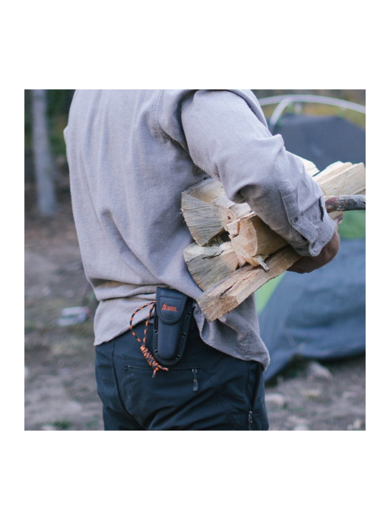 - Sturdy Holster – Riveted belt holster protects blade and provides storage for flint fire starter.