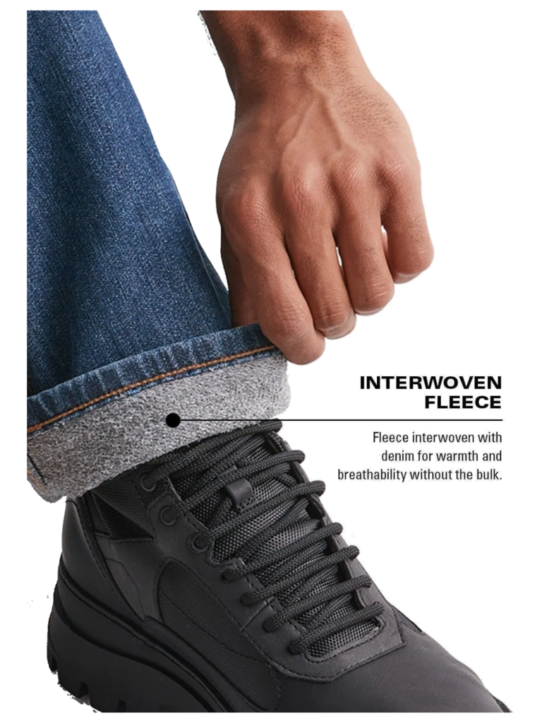 Fleece interwoven with denim for warmth and breathability without the bulk.