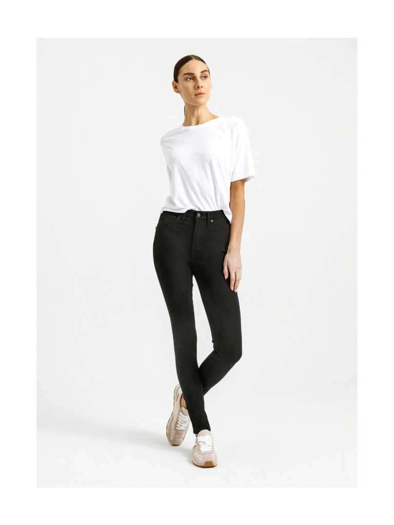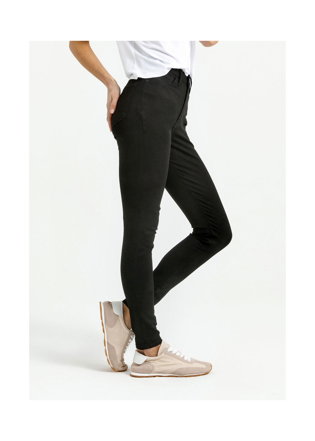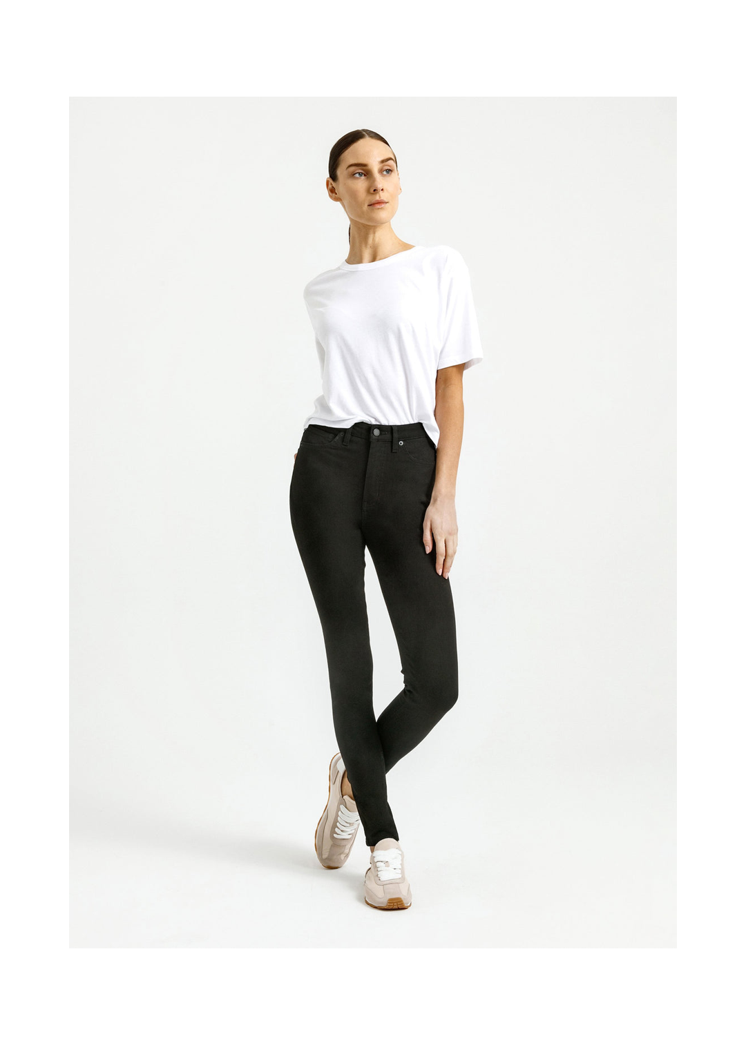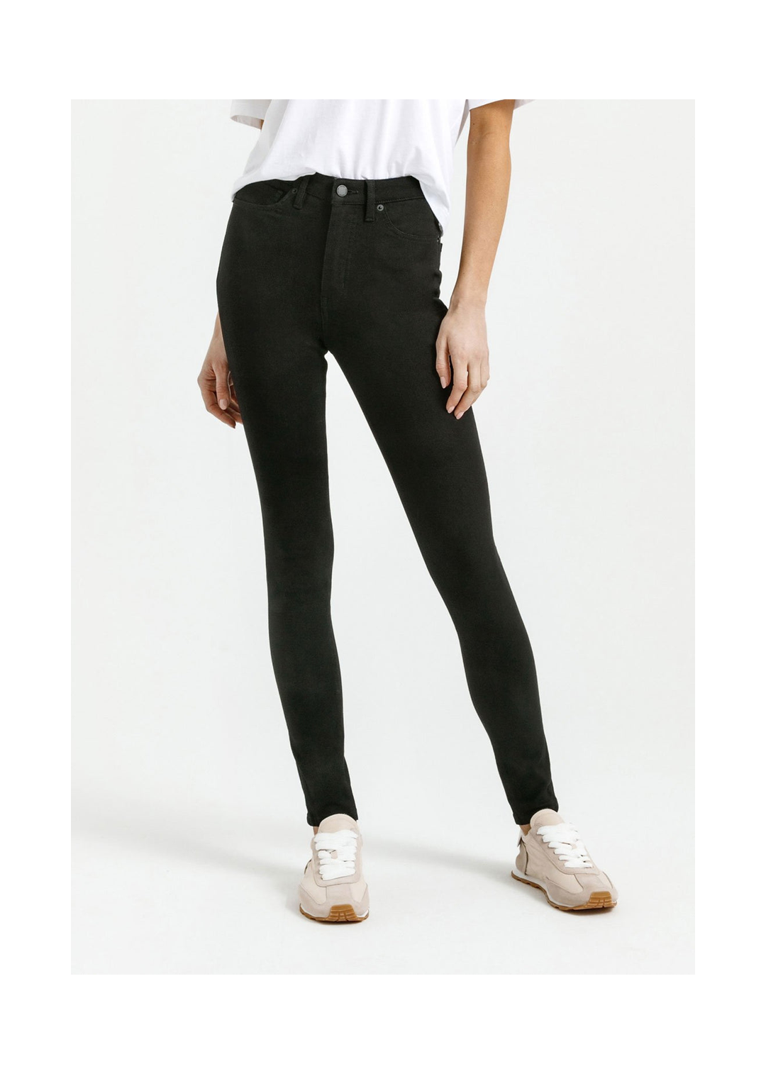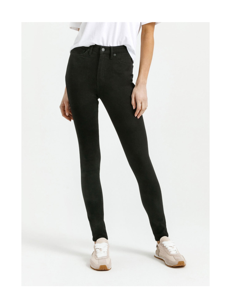 High rise sits at the belly button. Hugs body from waist to ankle.