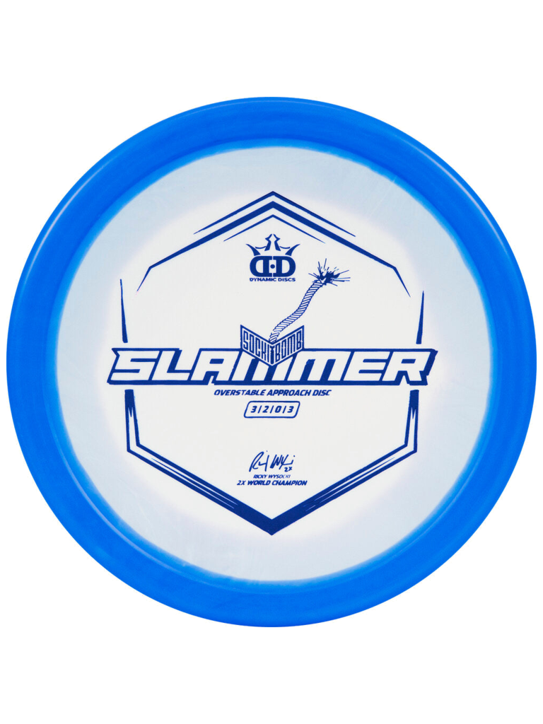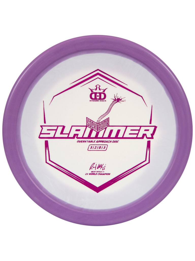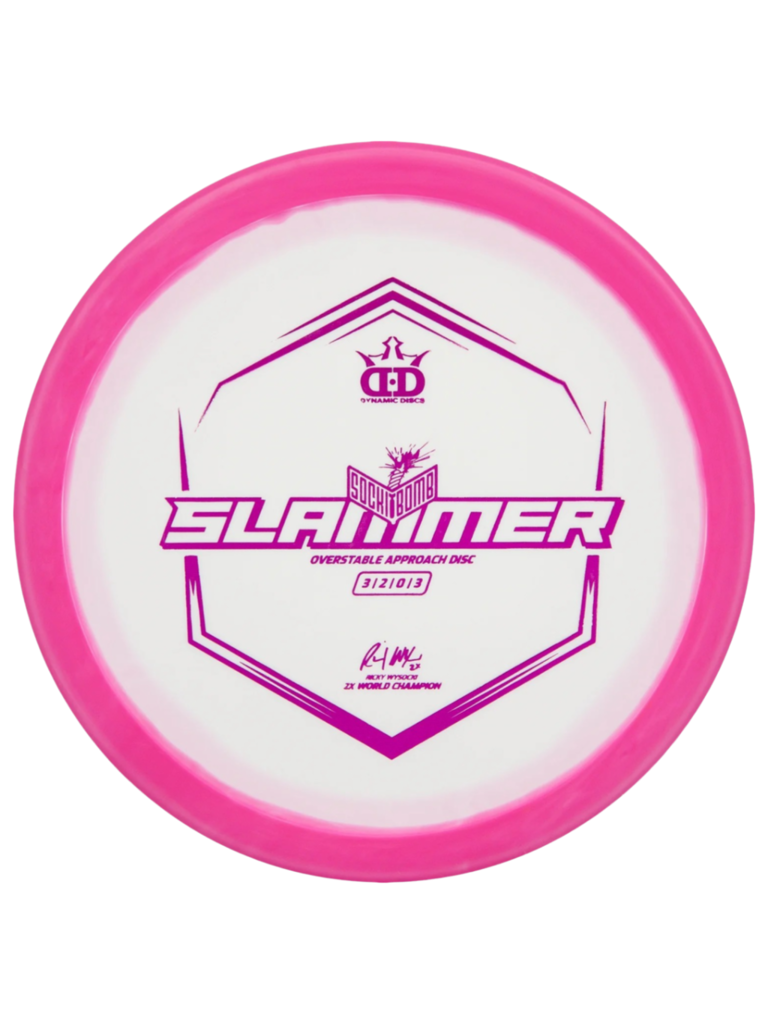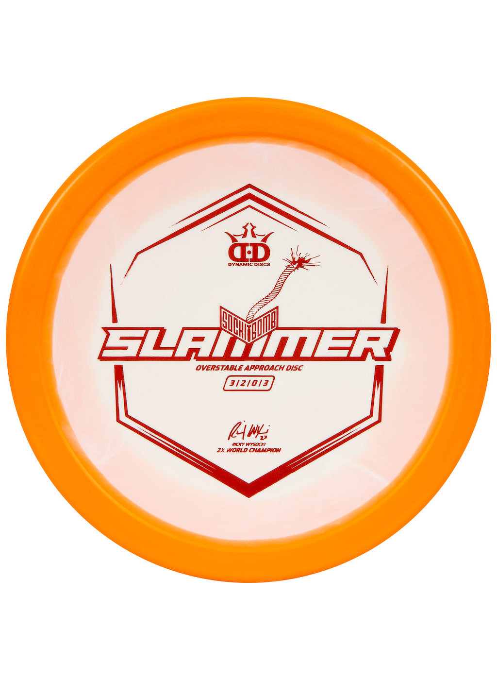 The Sockibomb Slammer is an all new mold based on the grip of the original Dynamic Discs Slammer and the consistency Ricky Wysocki loves in the Westside Discs Harp. The dependability of the Sockibomb Slammer is a must have for players of all skill levels and arm speeds. It is a super overstable throwing putter that can be thrown both backhand and forehand with a predictable finish every time, even into a strong headwind. It was created in collaboration with 2x World Champion Ricky Wysocki and is here to improve your approach game.