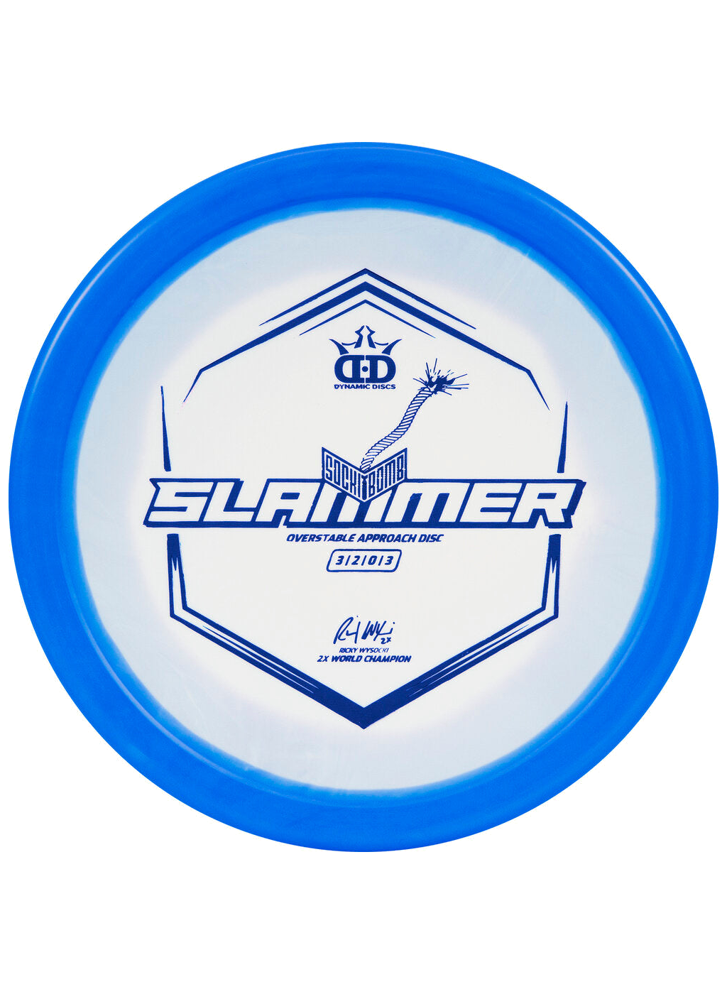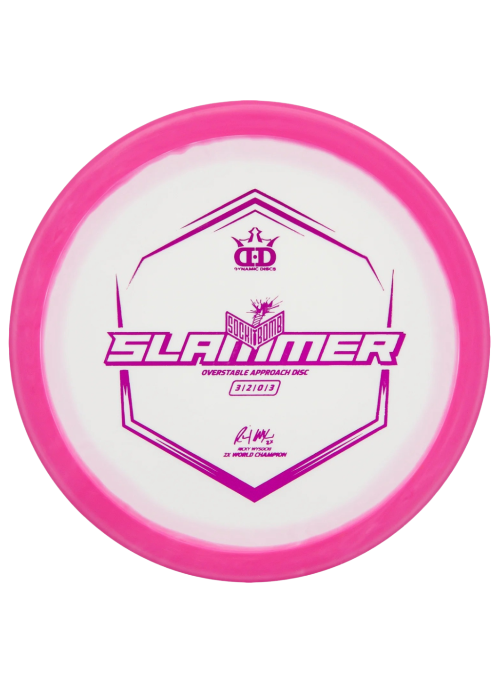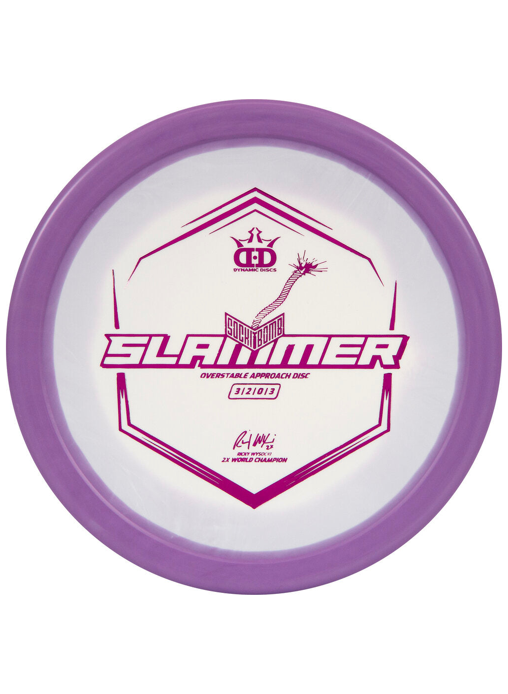The Sockibomb Slammer is an all new mold based on the grip of the original Dynamic Discs Slammer and the consistency Ricky Wysocki loves in the Westside Discs Harp. The dependability of the Sockibomb Slammer is a must have for players of all skill levels and arm speeds. It is a super overstable throwing putter that can be thrown both backhand and forehand with a predictable finish every time, even into a strong headwind. It was created in collaboration with 2x World Champion Ricky Wysocki and is here to improve your approach game.