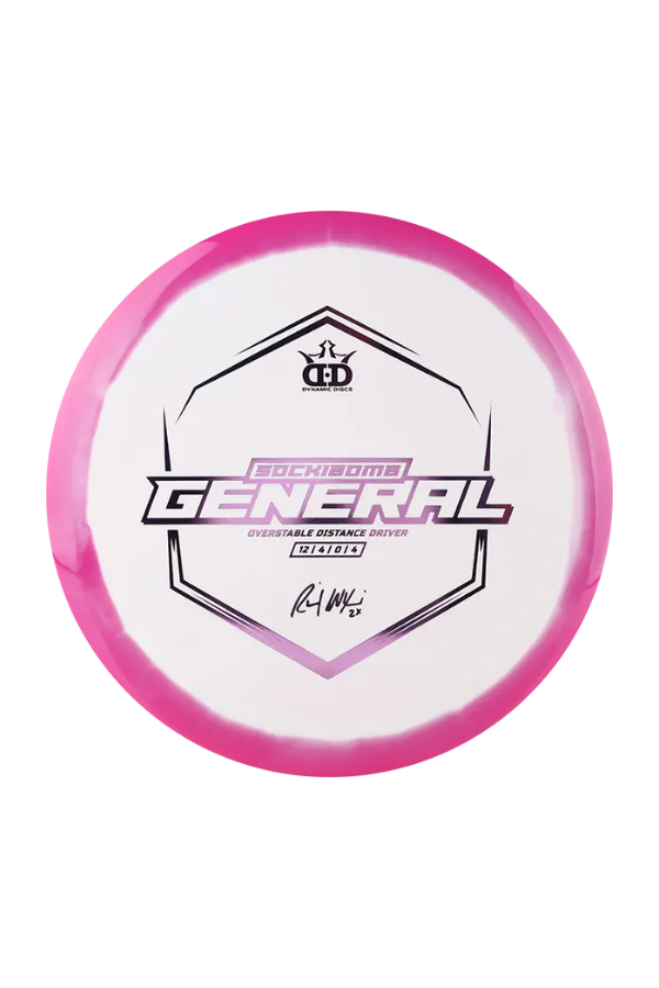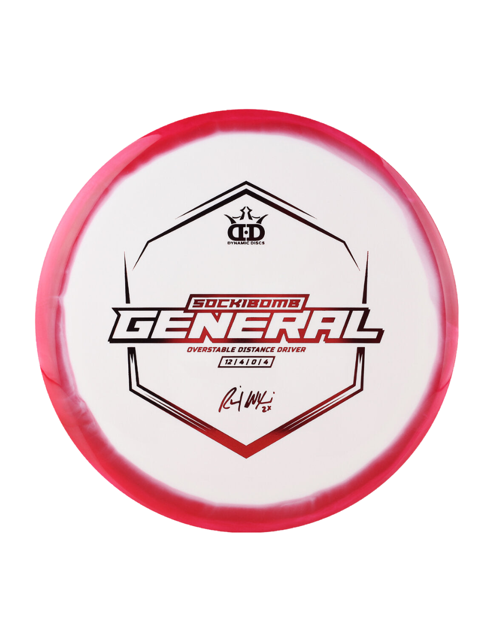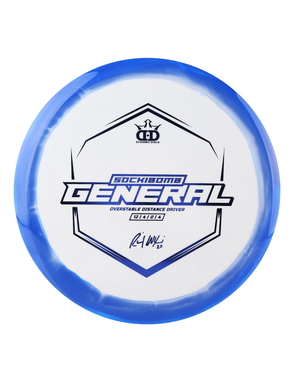 The Sockibomb General from Dynamic Discs is a new overstable distance driver and the latest addition to the Supreme Series lineup. Designed in collaboration with 2x World Champion Ricky Wysocki, this commanding distance driver is tailored for maximum distance flights for those players with higher arm speeds. Those with slower arm speeds will find the General a reliable, repeatable, wind-fighting utility disc.