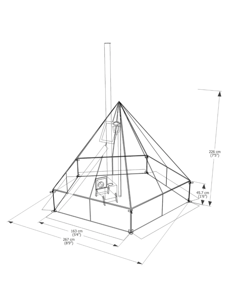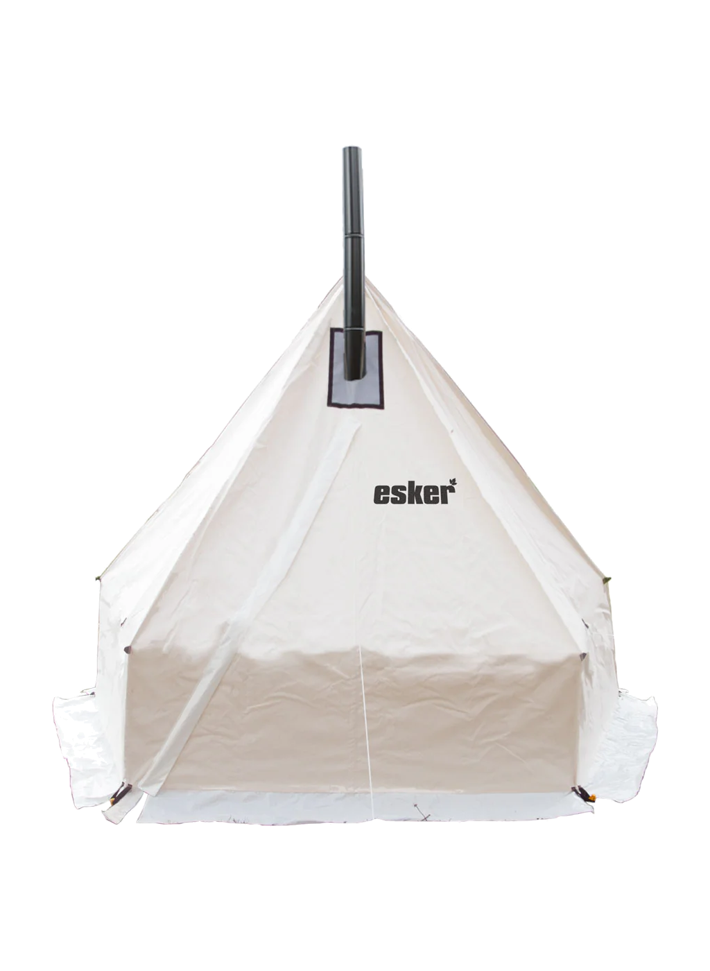 The Esker Arctic Fox 9x9 winter camping hot tent provides a 5-sided pentagonal design in a lightweight, portable and durable winter hot tent perfect for the great outdoors. Made from Sunforger 10.10 oz army duck cotton, it comes standard with an installed stove pipe ring, an air vent, internal loops for a drying line, and a 2-way zippered opening for comfort and function. The Arctic Fox 9x9 sleeps 1-2 people comfortably.