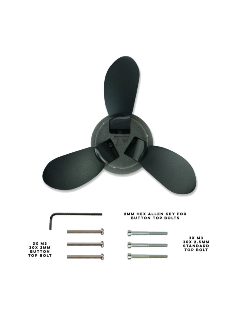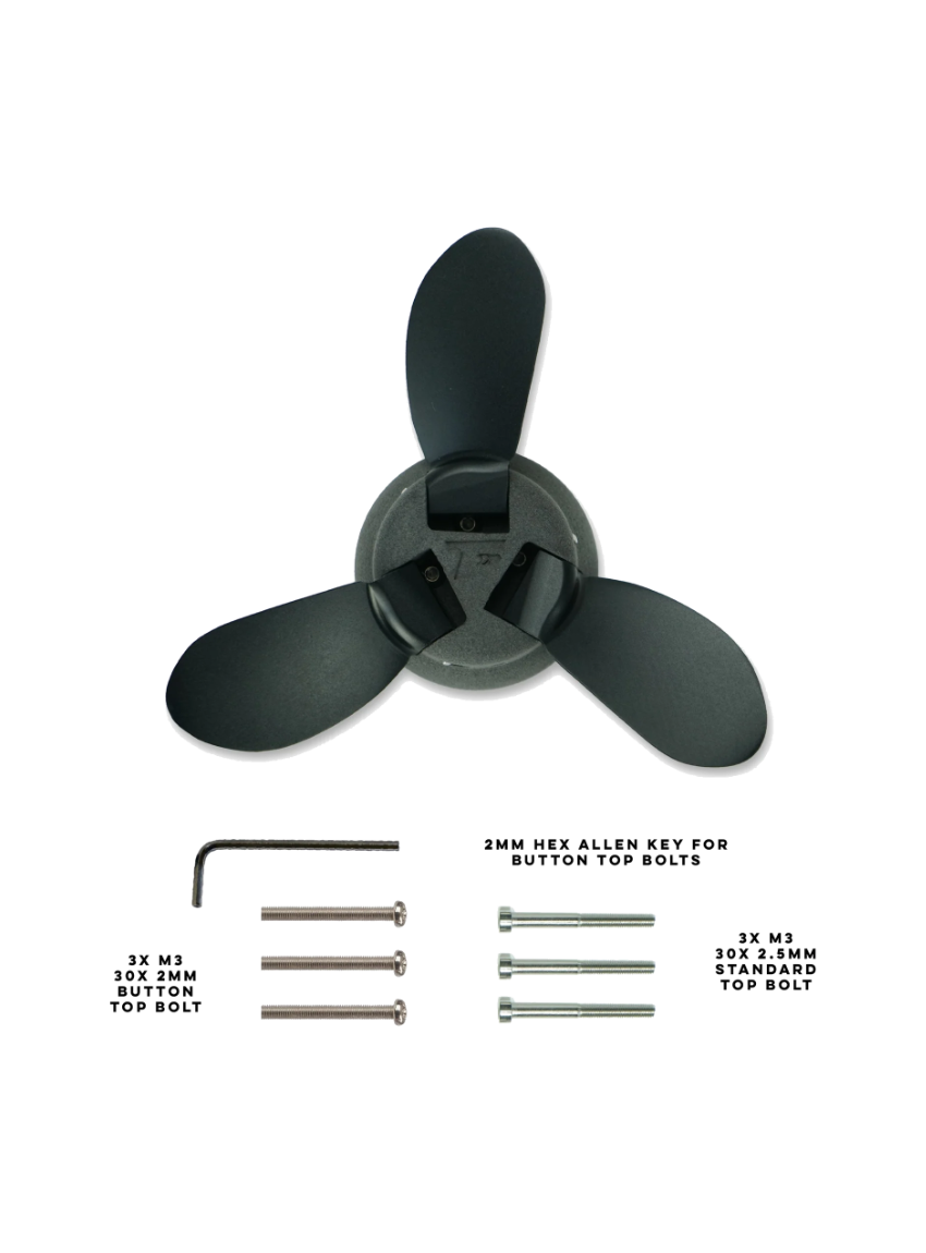 3x M3 30mm 2.5mm Standard Propeller Bolts can be used, these are the same as propeller bolts used on the 2 blade hub. Alternatively, 3x M3 30mm 2mm Button Top Propeller Bolts can be used to improve hydrodynamics, a secondary tool required. As they are not in the flow of water, they do not cause formation of small bubbles that then enter the prop.