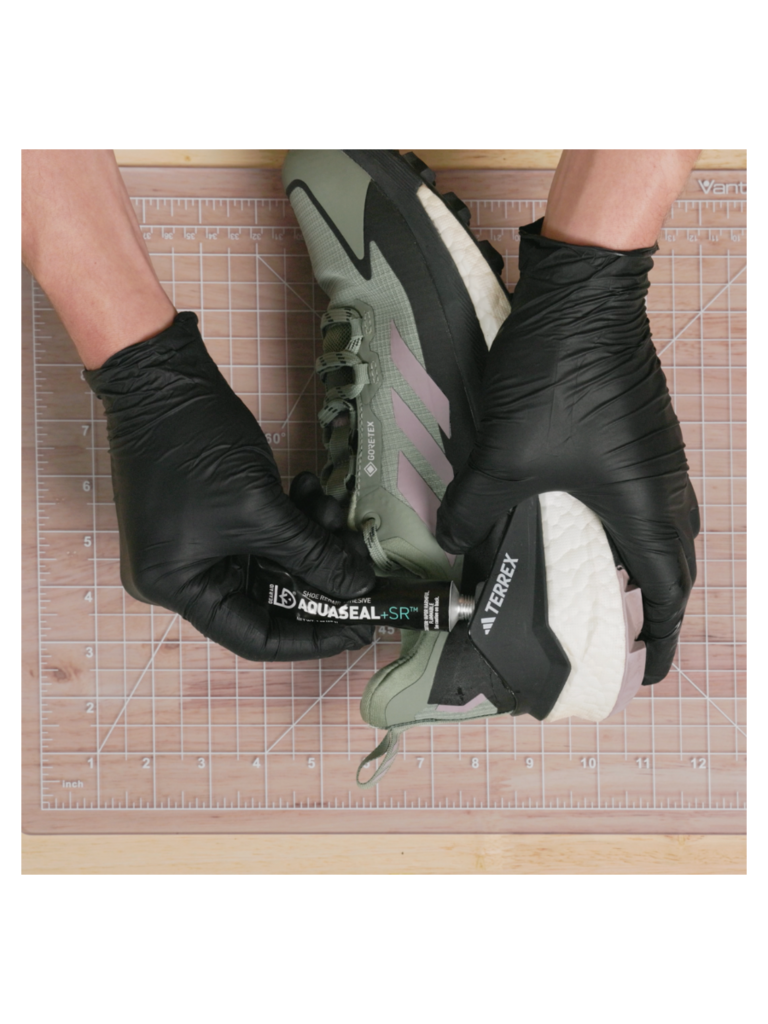 - Apply Aquaseal SR. Squeeze a thin, even layer onto, or into, the damaged section — whether it’s a peeling sole, cracked midsole, or worn-out toe. Use a stick or brush to shape and smooth it as needed.