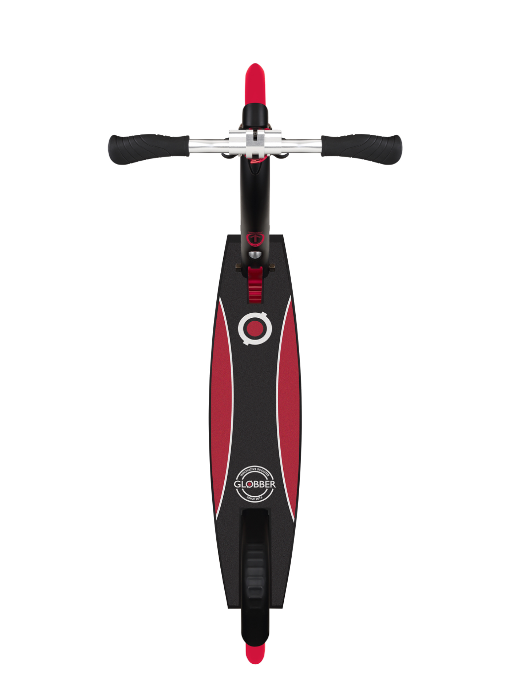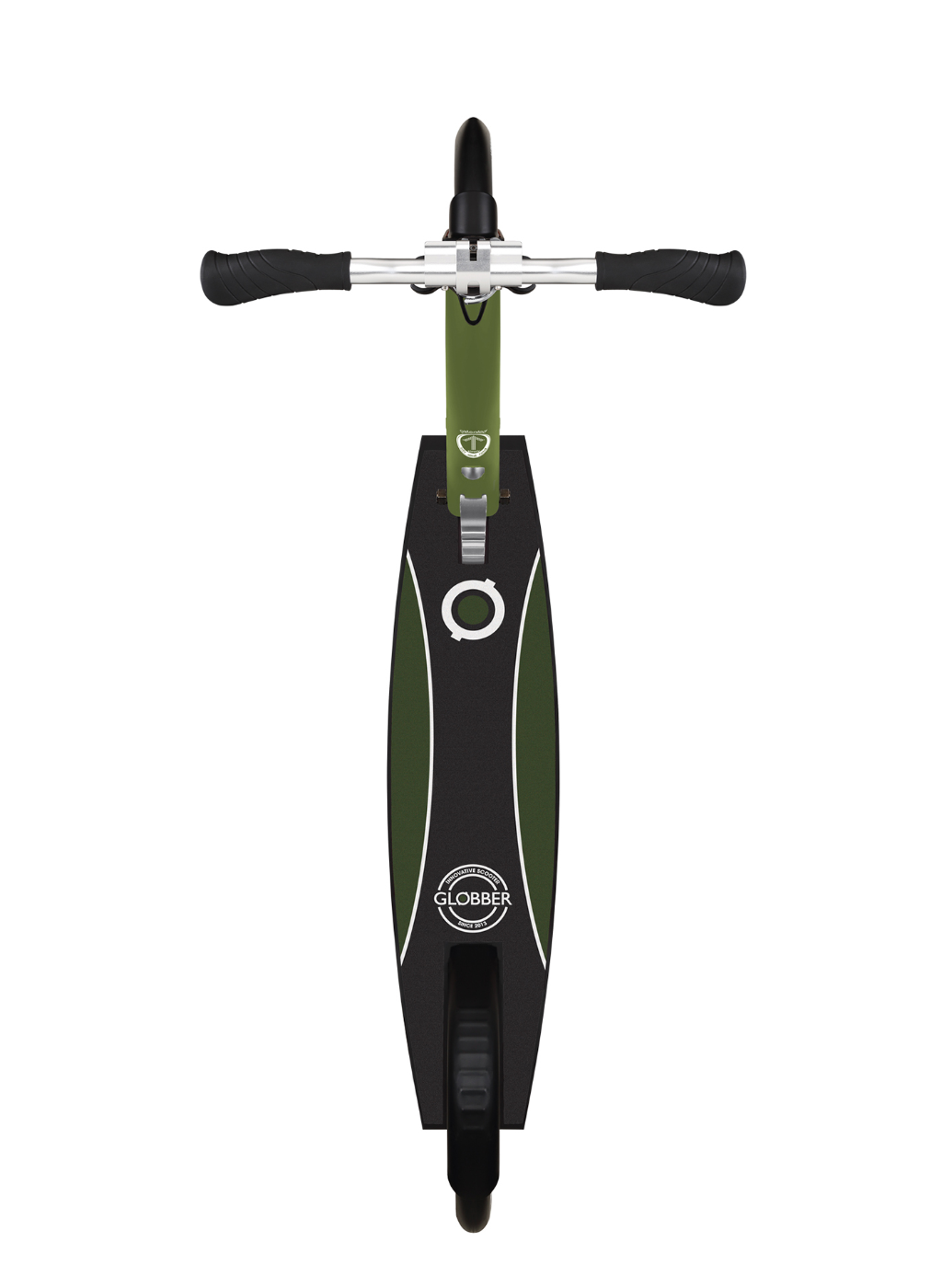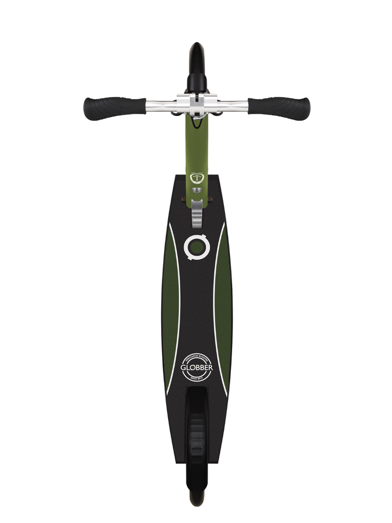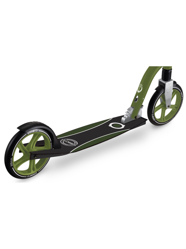 - Foldable big wheel kick scooter with suspension, equipped with Globber’s patented folding system that transforms the scooter into self-standing or folded mode for convenience and easy storage.