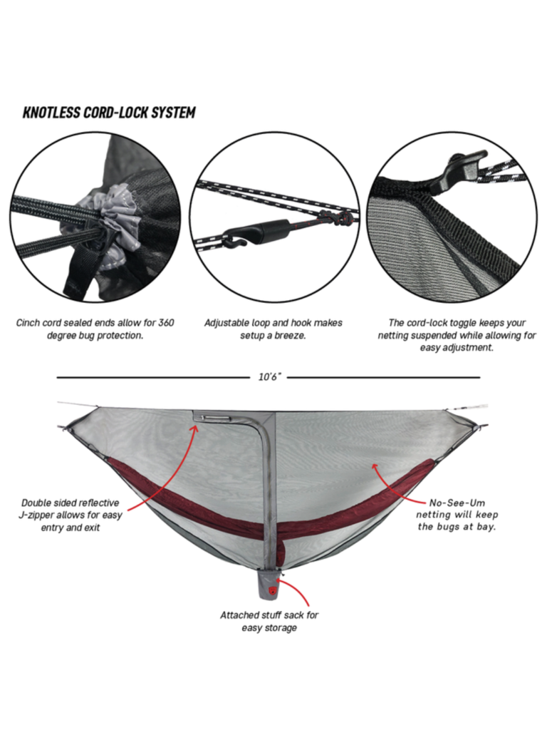 - Dimensions: 10'6" long x 5' tall (Fits an 11' hammock)
