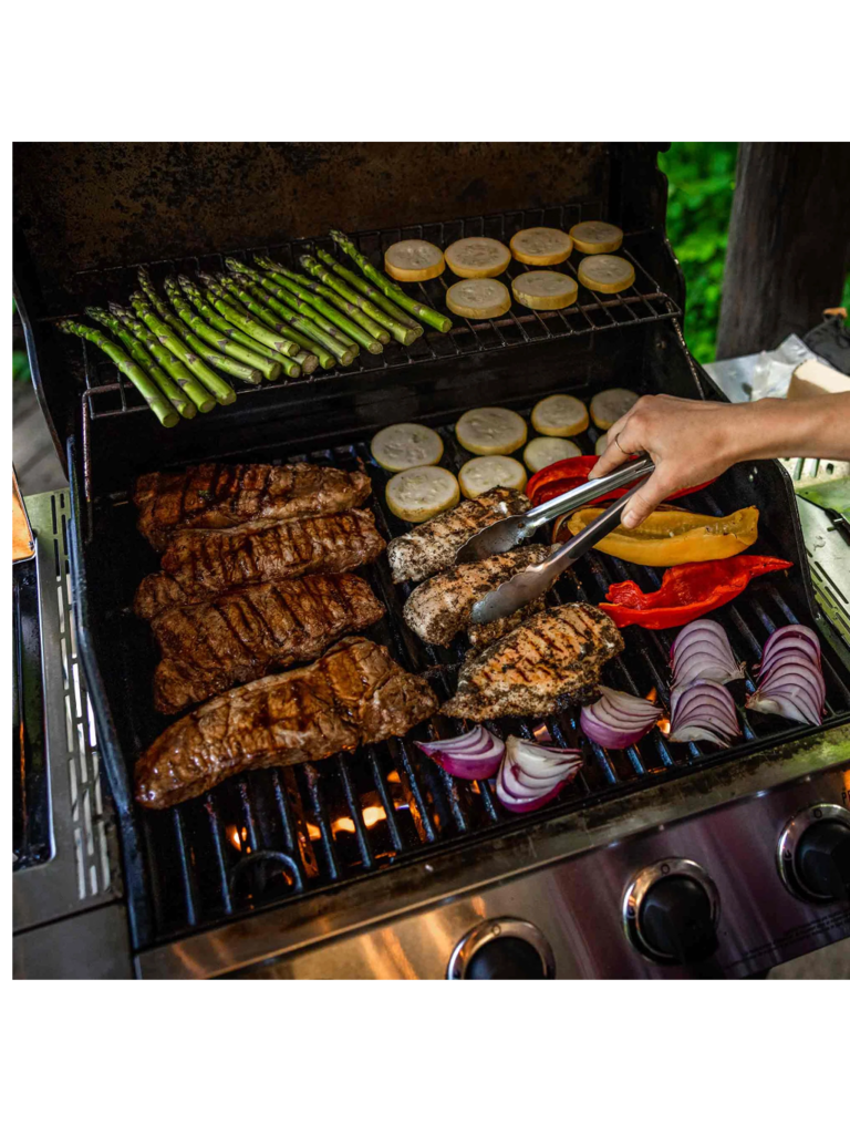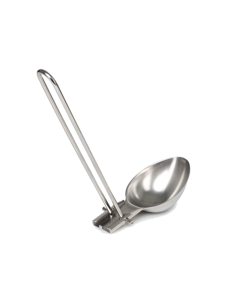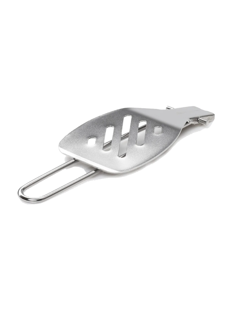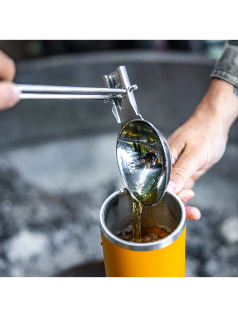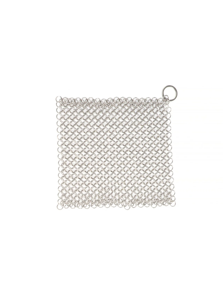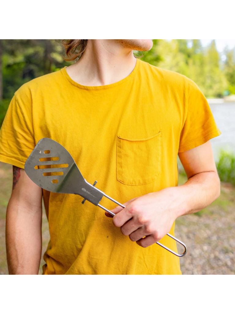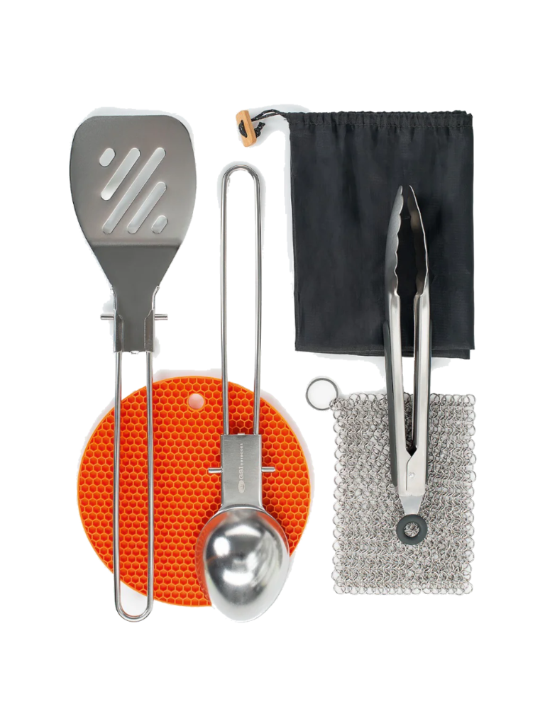 Includes: *Glacier stainless folding spatula, folding dual position spoon, locking tongs with insulated grips, chain mail pot scrubber, multi-function silicone pot gripper/ trivet, rpet cloth storage sack with drawstring and cord lock.*