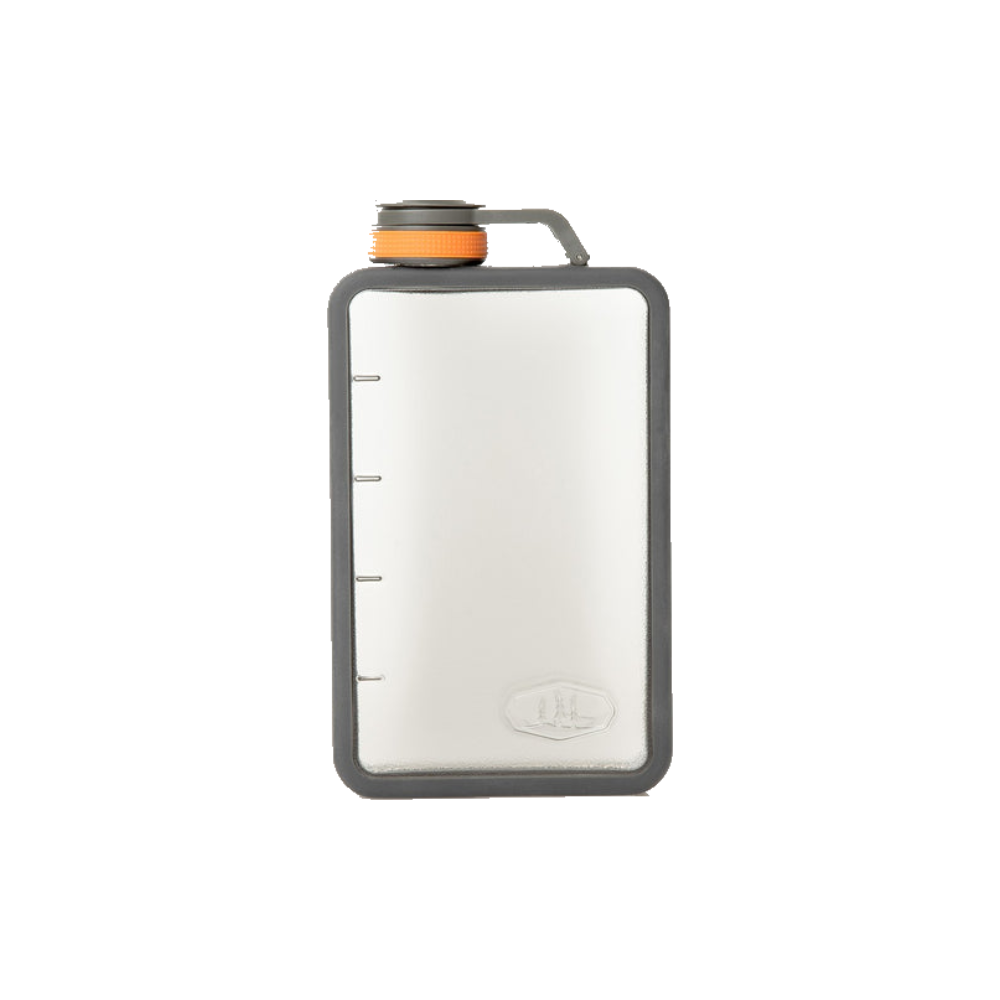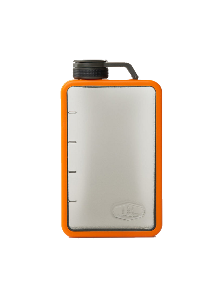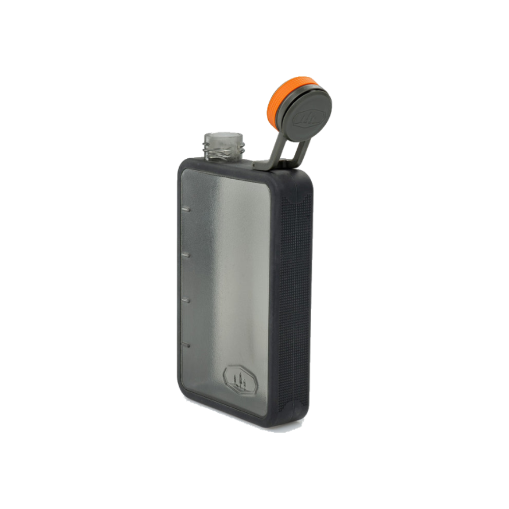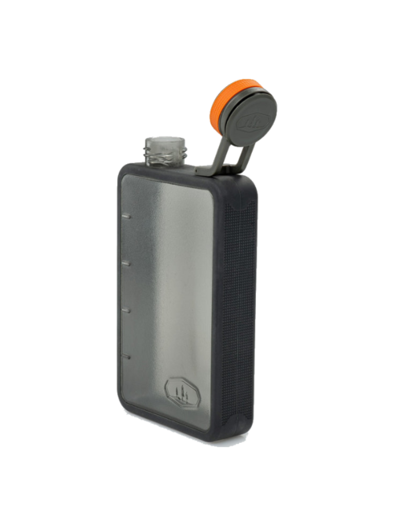 The Boulder 10 Flask holds 10 fl oz, has a shatter-resistant body with bumper, graduations, and a hinged silicone cap making it impossible to misplace.
