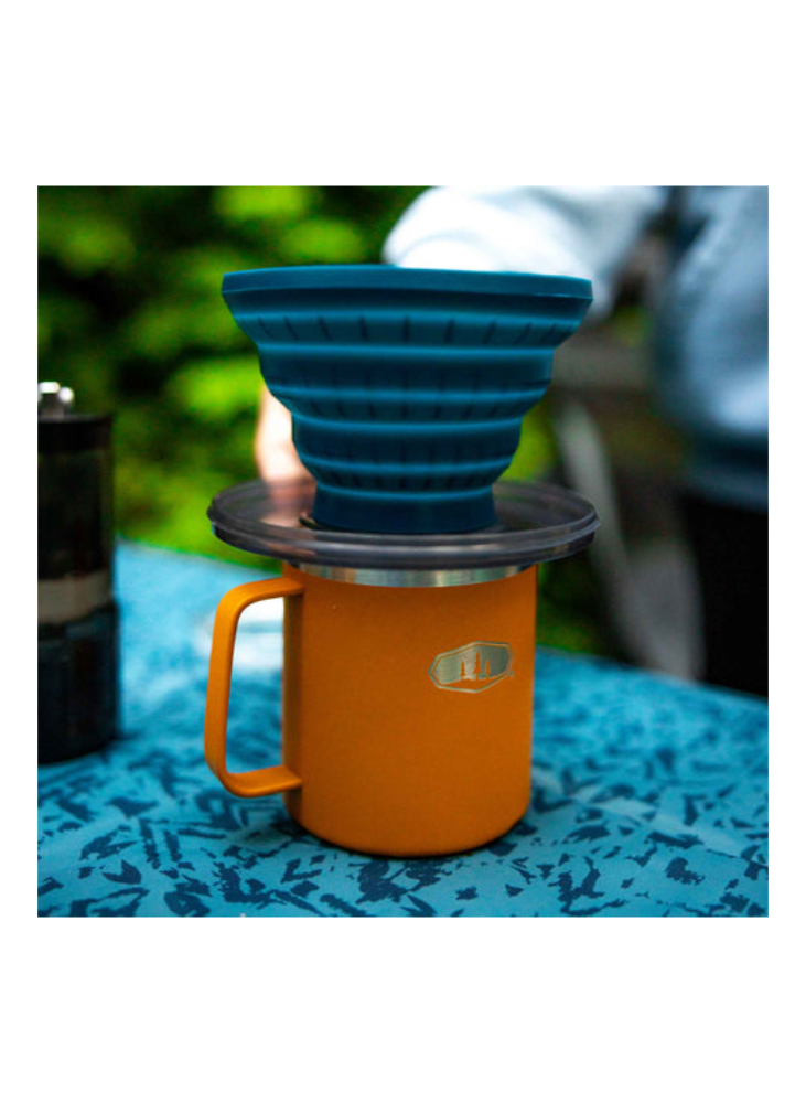 Simply set the filter on top of your favorite container, from a wide mouth water bottle to a small pot, add any brand of #4 filter, grounds and water and voila, eye-opening drip coffee just like home.