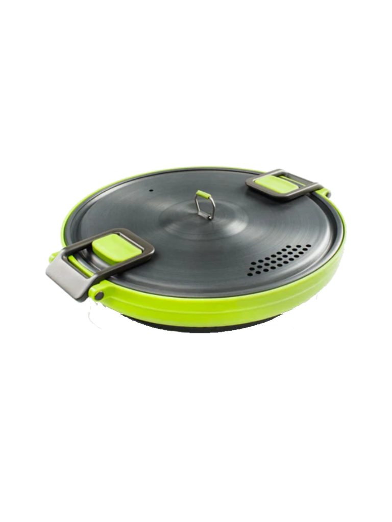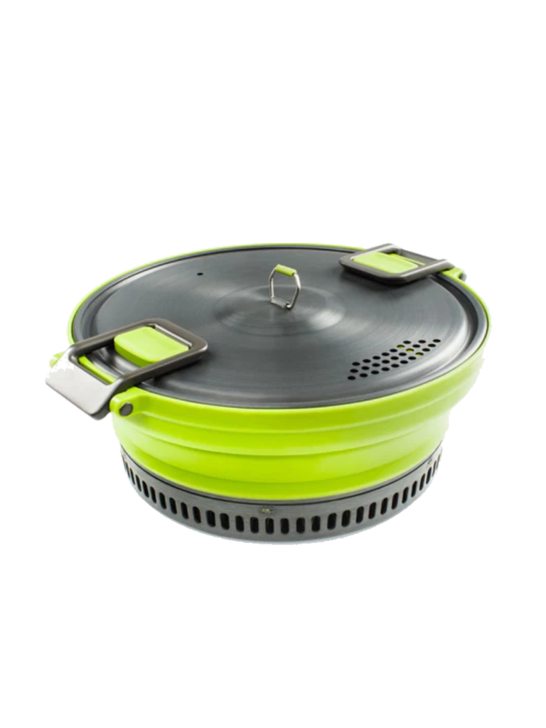 Create an accountSo, you want maximum performance for minimal weight? Our 3L Escape HS Pot leverages a hybrid design that brings together the packability silicone and the efficiency of a hyper-conductive anodized base to create a pot that cooks 30% faster and takes up 53% less space in your pack. It holds a hefty 3 liters, but compacts to just 2.1” tall. The lid doubles as a strainer and has integrated silicone thumbpads to help prevent burns. Dual bail handles make pick-up easy, then fold out of the way and lock the lid in place. The silicone has graduations molded in, so measurements are always accurate, and – if you want – you can nest other Escape tableware pieces inside. This is a whole lotta pot for a little bit of space.