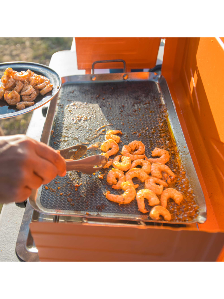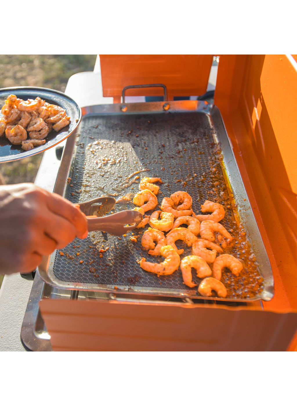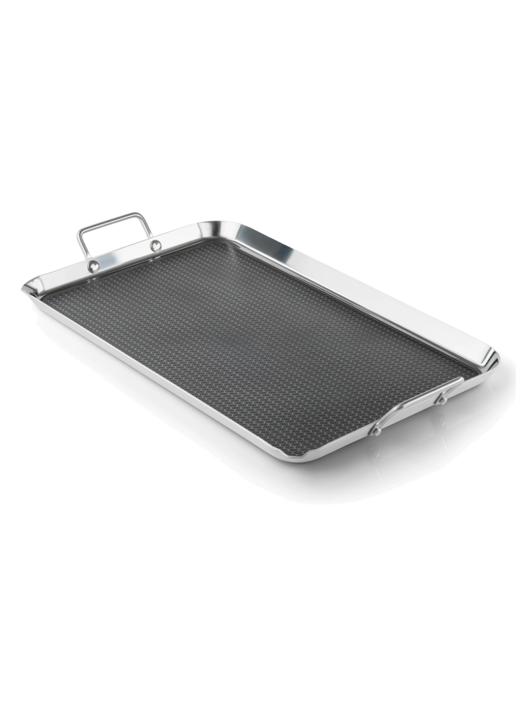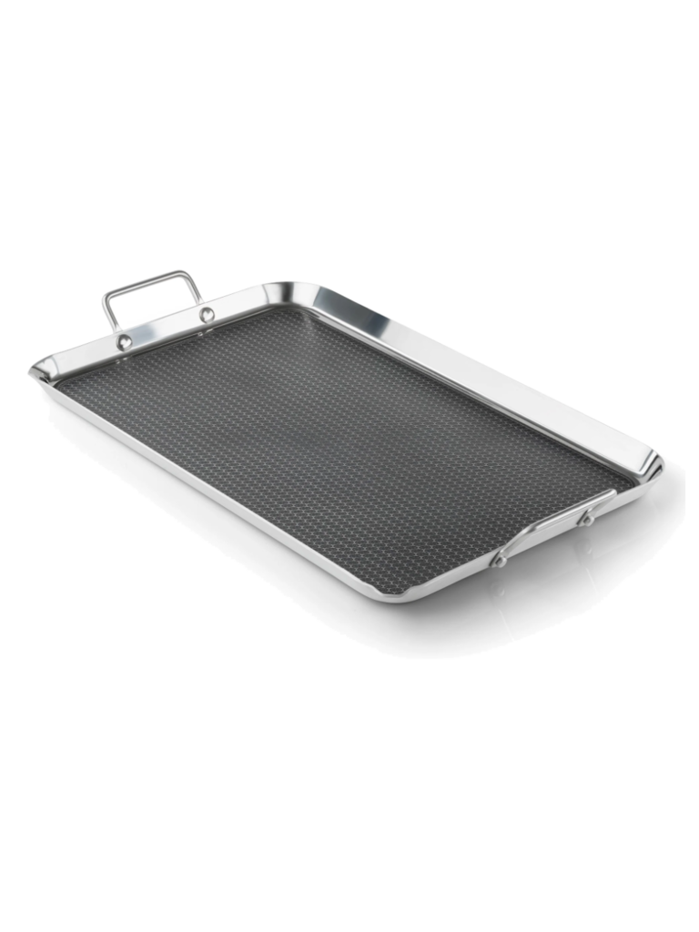 The combination reduces hot spots and increases scratch resistance, especially when using metal chef’s tools. Designed for use on two or three-burner propane stoves. Handles make it easy to lift, move and store.
