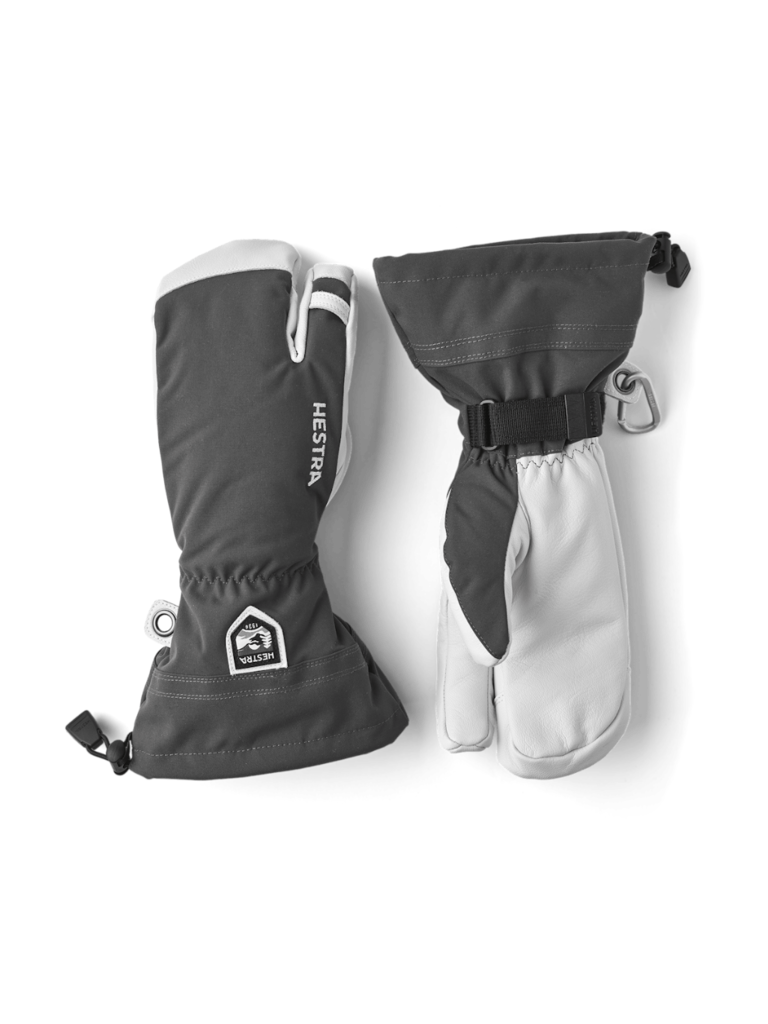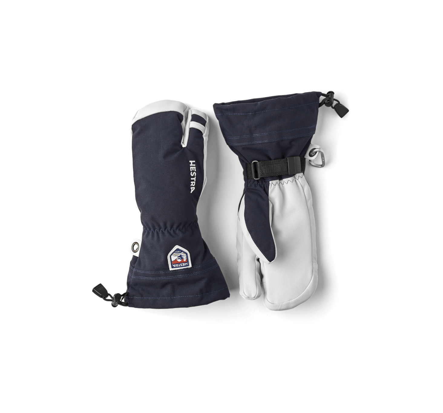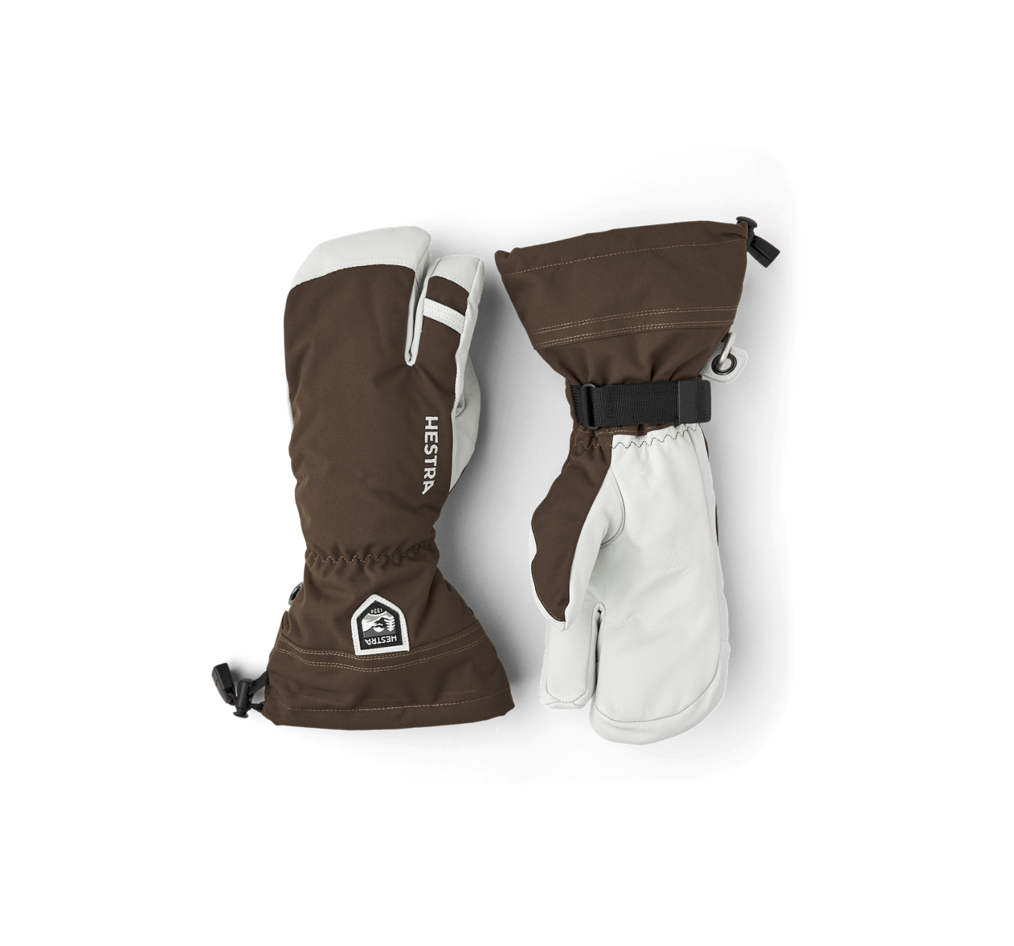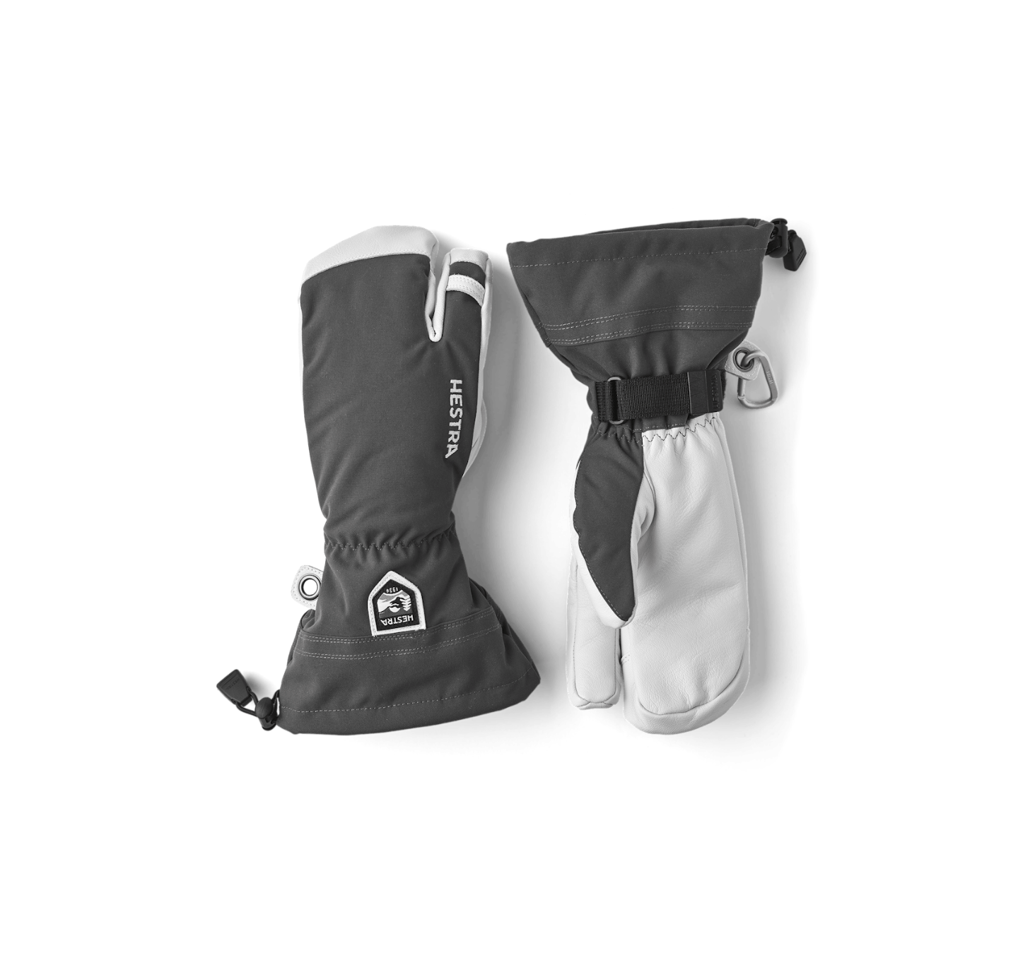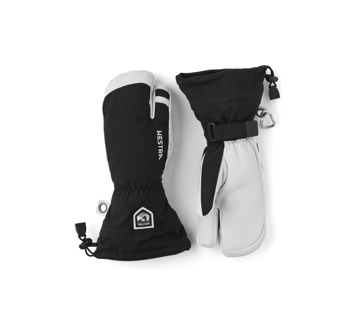 Hestra's Army Leather Heli Ski was originally created for ski guides in western Canada who needed a reliable and warm ski glove for long days of snow and cold. Made with durable goat leather that provides exceptional grip and feel, and with a waterproof three-layer polyamide fabric backhand. This 3-finger model is for those looking for more warmth but who still need to maintain the ability to work with your fingers, and it has a range of smart functions thathelp when you can't go inside to warm up so often. The liner, for example, is easy to take out and exchange if it gets moist or to adapt to varying activity levels and temperatures. And the long collar has a snowlock that, together with a Velcro strap on the wrist, ensures warmth stays inside the glove. A wrist strap reduces the chance of dropping the glove if you take it off to answer the phone or adjust your equipment. The included carabiner and leather eyelet on the pinky finger also let you hang the glove with its opening facing downwards on your ski pants or climbing harness – practical for avoiding it being filled up with snow if you are just working with thin liners on your hands. A durable, flexible companion for skiers that spend a lot of time outdoors and who often find themselves far from the ski resort and its comforts. Also available in mitt and 5-fingers models.