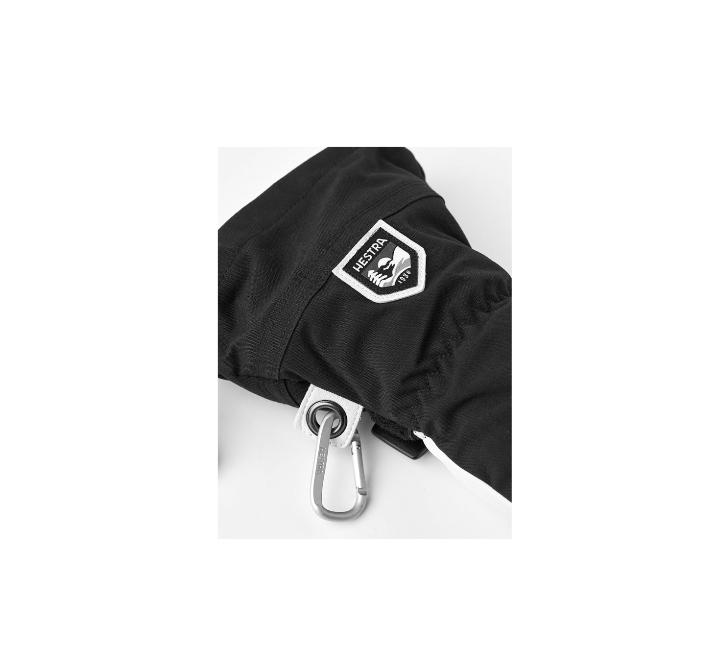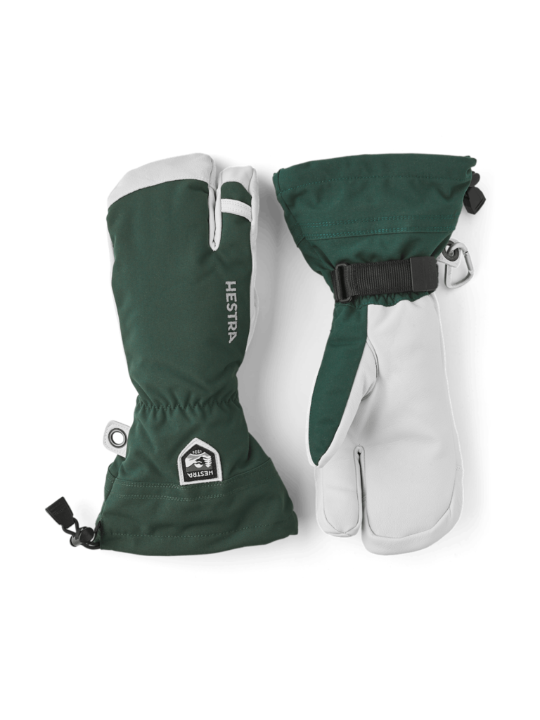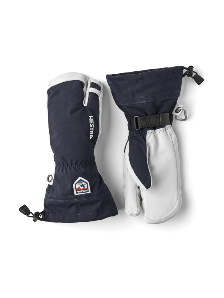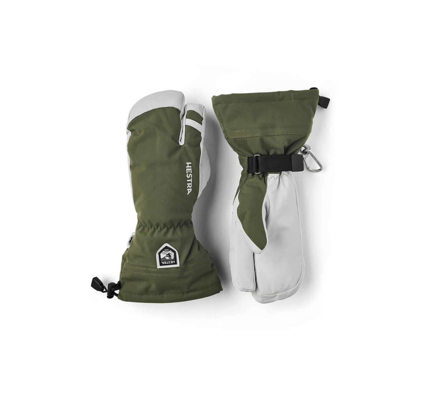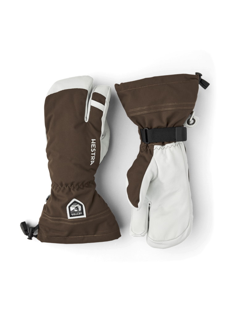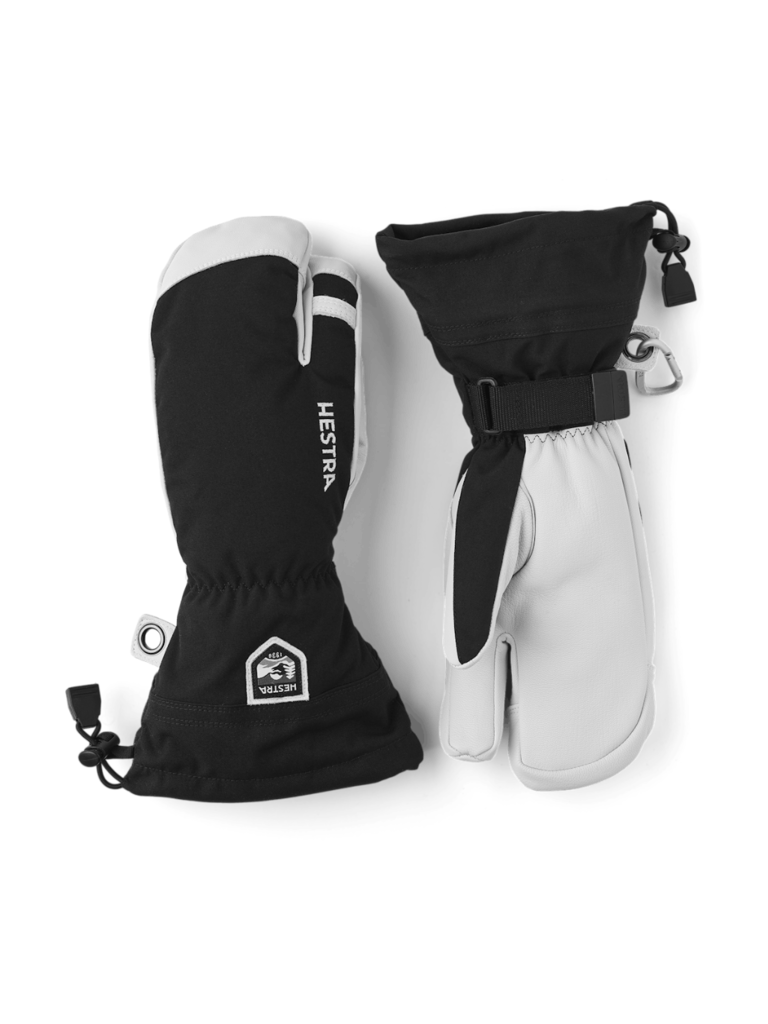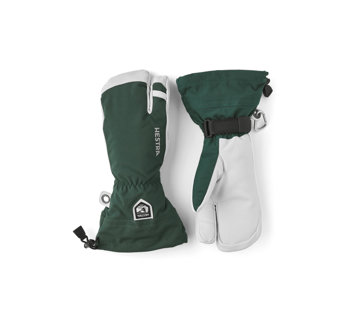 Hestra's Army Leather Heli Ski was originally created for ski guides in western Canada who needed a reliable and warm ski glove for long days of snow and cold. Made with durable goat leather that provides exceptional grip and feel, and with a waterproof three-layer polyamide fabric backhand. This 3-finger model is for those looking for more warmth but who still need to maintain the ability to work with your fingers, and it has a range of smart functions thathelp when you can't go inside to warm up so often. The liner, for example, is easy to take out and exchange if it gets moist or to adapt to varying activity levels and temperatures. And the long collar has a snowlock that, together with a Velcro strap on the wrist, ensures warmth stays inside the glove. A wrist strap reduces the chance of dropping the glove if you take it off to answer the phone or adjust your equipment. The included carabiner and leather eyelet on the pinky finger also let you hang the glove with its opening facing downwards on your ski pants or climbing harness – practical for avoiding it being filled up with snow if you are just working with thin liners on your hands. A durable, flexible companion for skiers that spend a lot of time outdoors and who often find themselves far from the ski resort and its comforts. Also available in mitt and 5-fingers models.