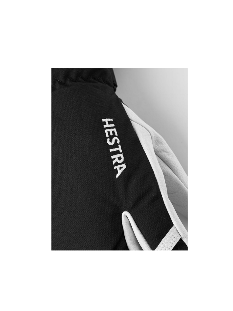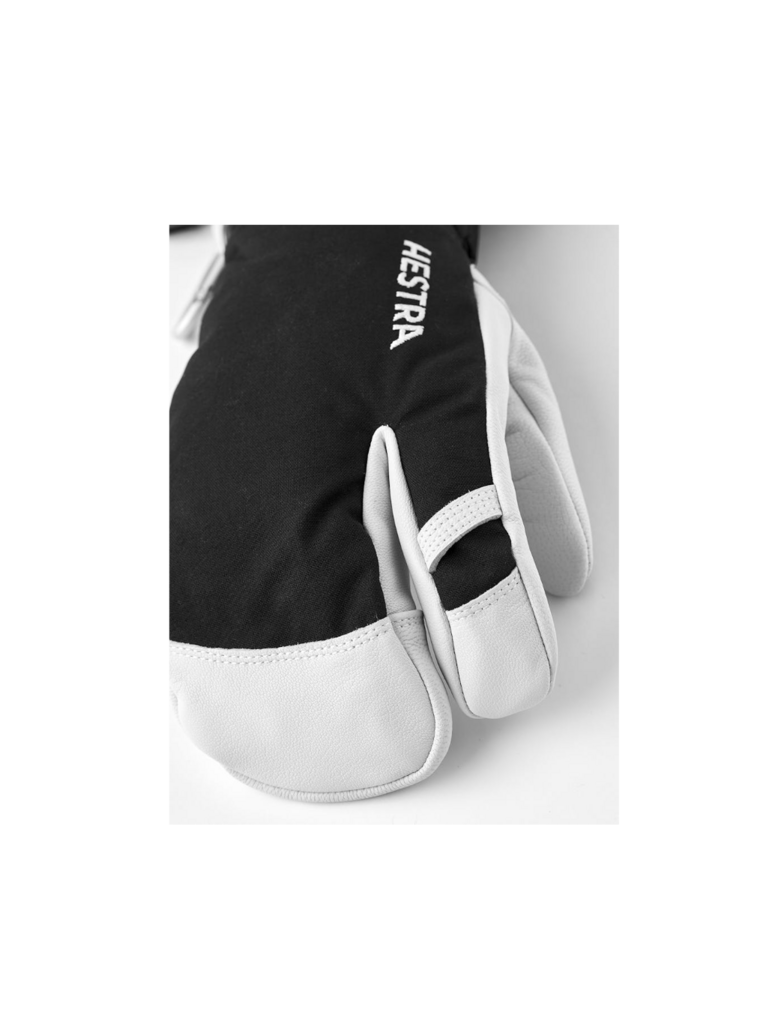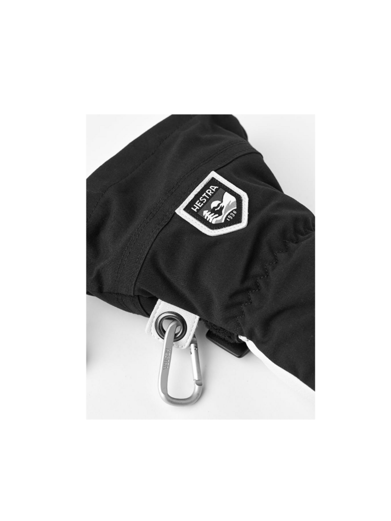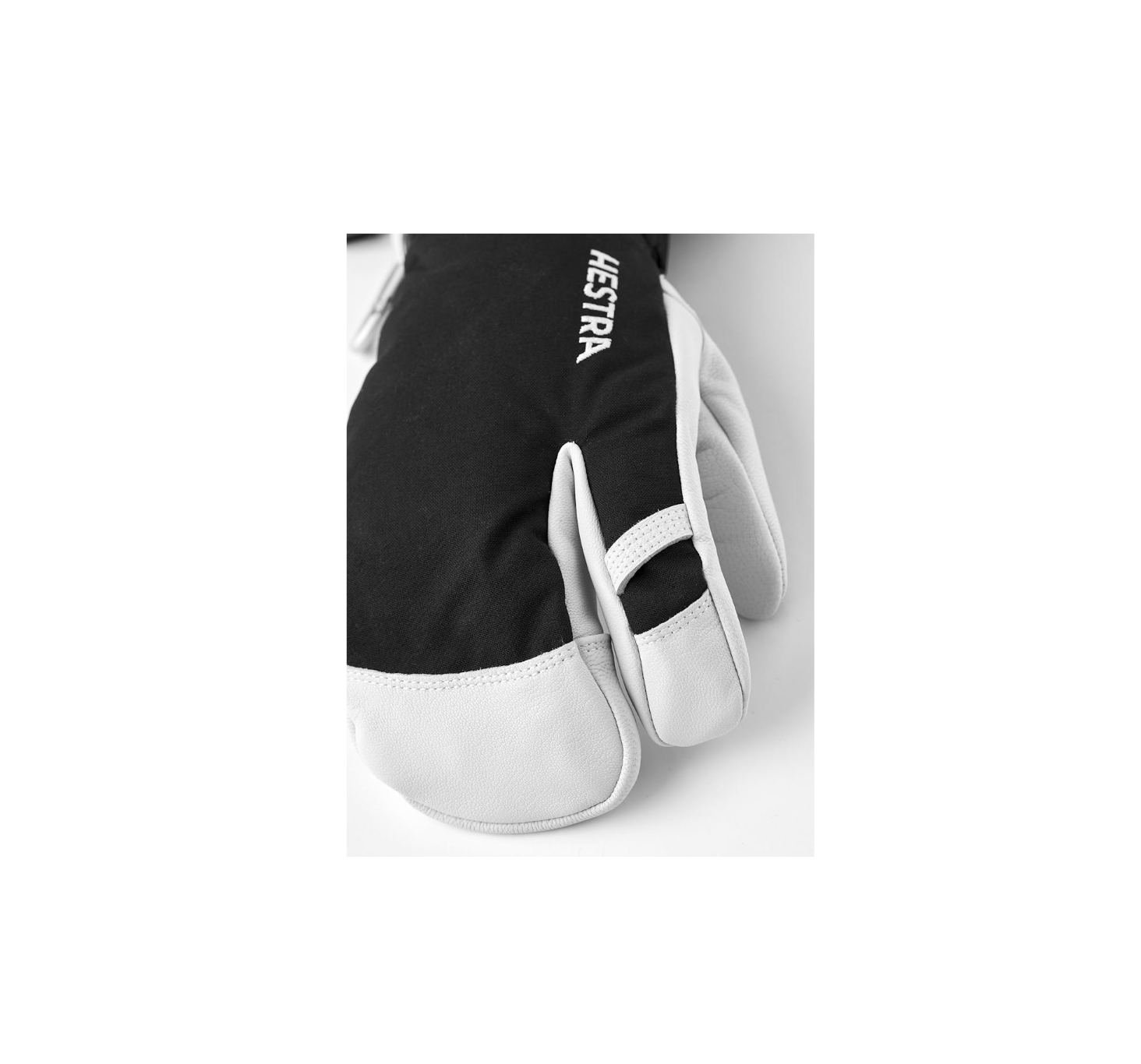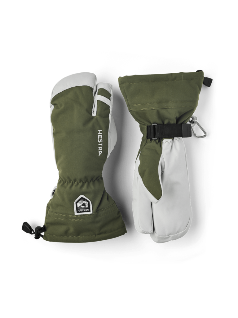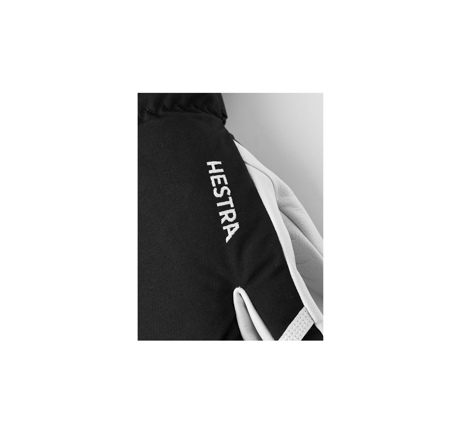 Hestra's Army Leather Heli Ski was originally created for ski guides in western Canada who needed a reliable and warm ski glove for long days of snow and cold. Made with durable goat leather that provides exceptional grip and feel, and with a waterproof three-layer polyamide fabric backhand. This 3-finger model is for those looking for more warmth but who still need to maintain the ability to work with your fingers, and it has a range of smart functions thathelp when you can't go inside to warm up so often. The liner, for example, is easy to take out and exchange if it gets moist or to adapt to varying activity levels and temperatures. And the long collar has a snowlock that, together with a Velcro strap on the wrist, ensures warmth stays inside the glove. A wrist strap reduces the chance of dropping the glove if you take it off to answer the phone or adjust your equipment. The included carabiner and leather eyelet on the pinky finger also let you hang the glove with its opening facing downwards on your ski pants or climbing harness – practical for avoiding it being filled up with snow if you are just working with thin liners on your hands. A durable, flexible companion for skiers that spend a lot of time outdoors and who often find themselves far from the ski resort and its comforts. Also available in mitt and 5-fingers models.