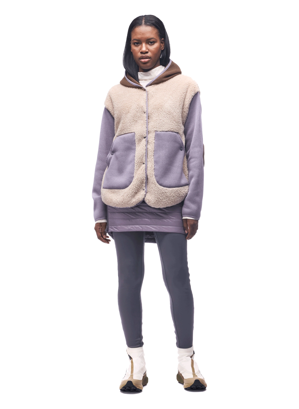 Loose-fit jacket combining Thermal Pro® Polartec® and comfy pile fleece for a blend of textures and performance. Fixed hood, snap-button pockets.