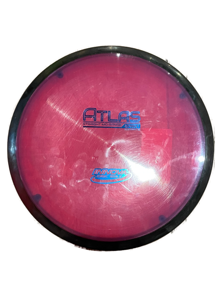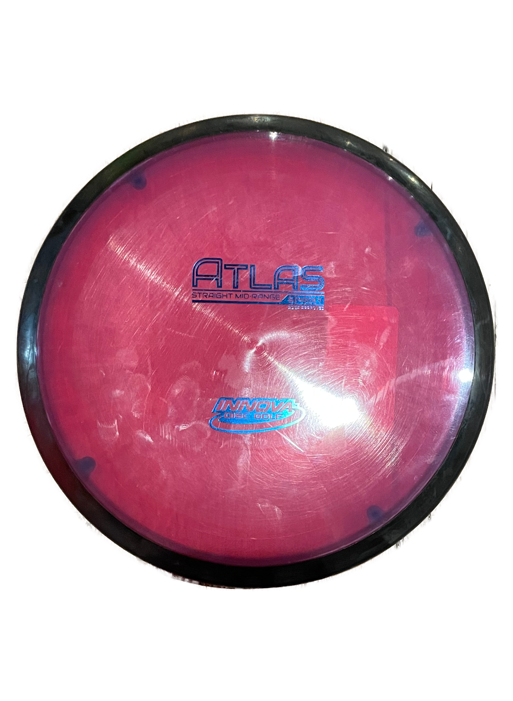 The Atlas is an overmold that combines a firm, low-profile flight plate with a grippy rim. This Mid-Range flies straight with minimal fade, combining accuracy and control with an ergonomic grip. The Atlas performs well for both backhand and forehand throwers forgiving small throwing errors better than any other Mid-Range. The Atlas features four 'compass points' located on the underside of the disc. These ports are where the rim is injected over the flight plate.
