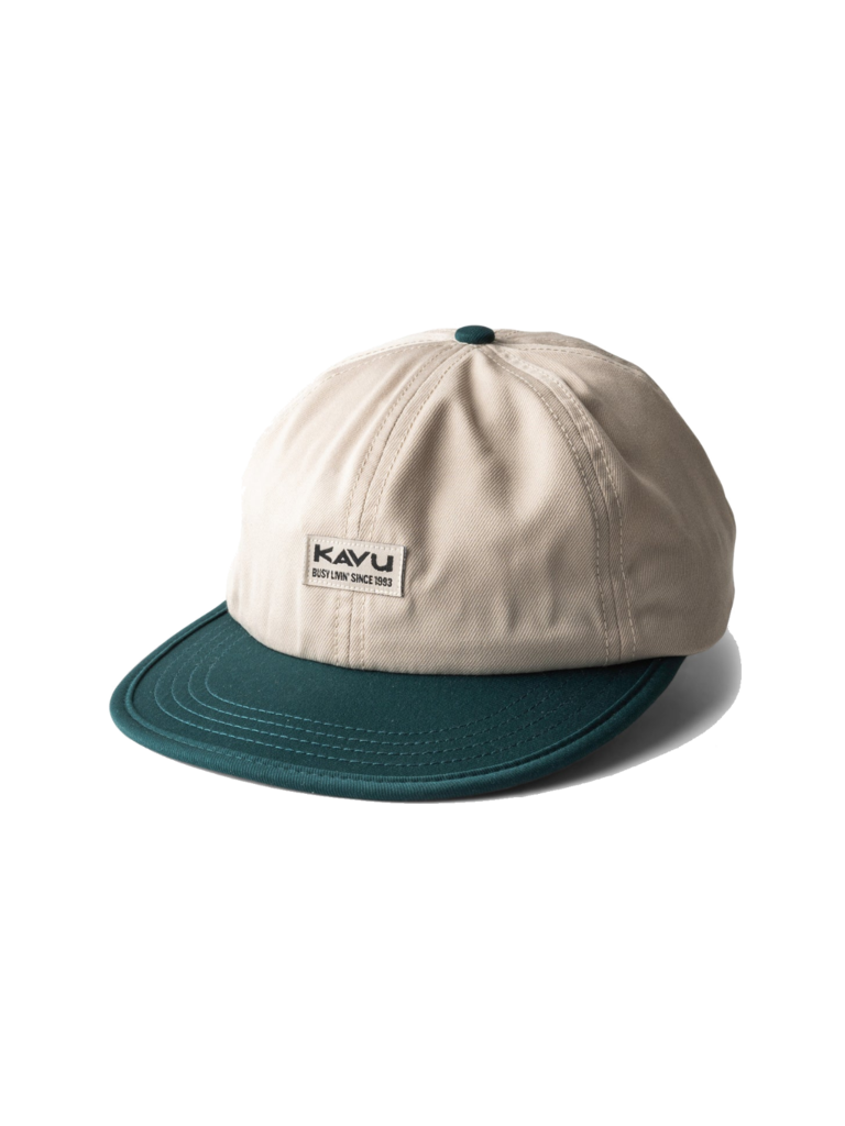 6 panel unstructured / low profile cap, KAVU logo label on front, soft foam bill, snap back closure, interior taping and moisture absorbing sweatband