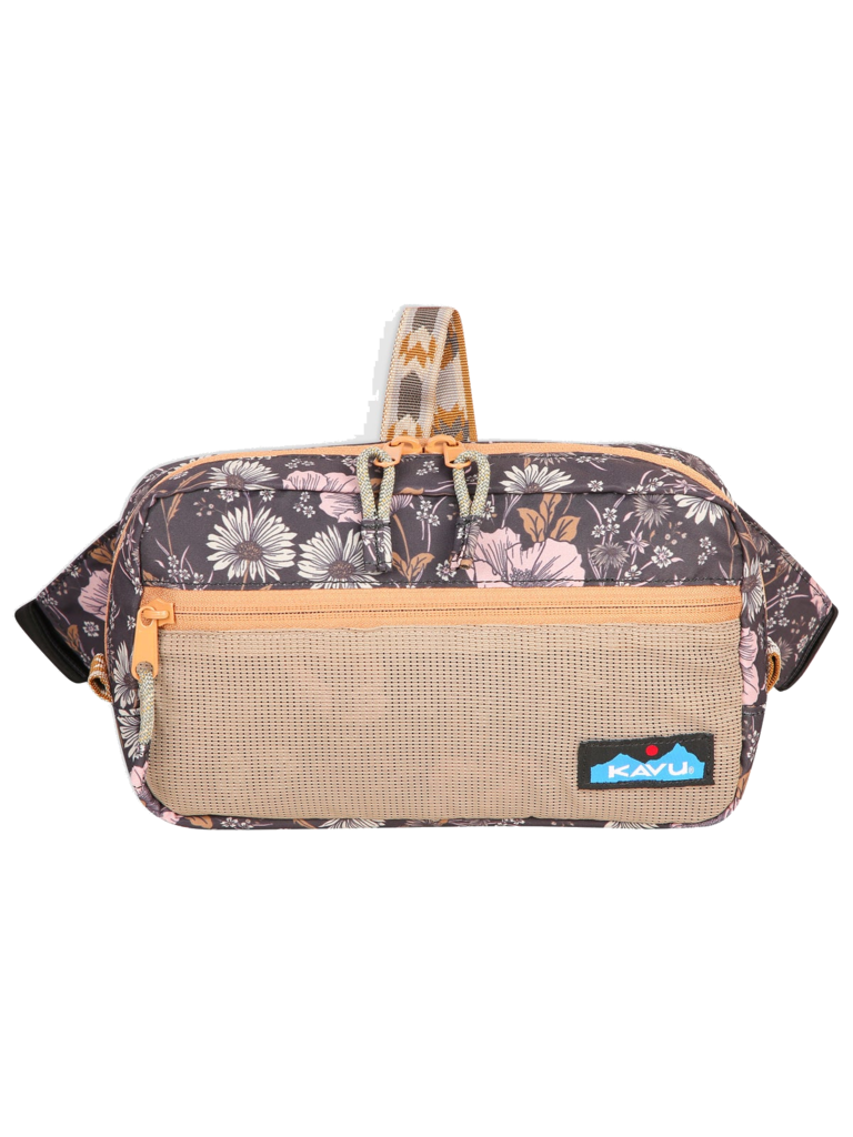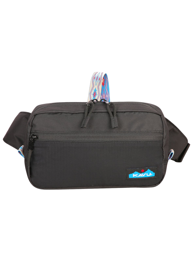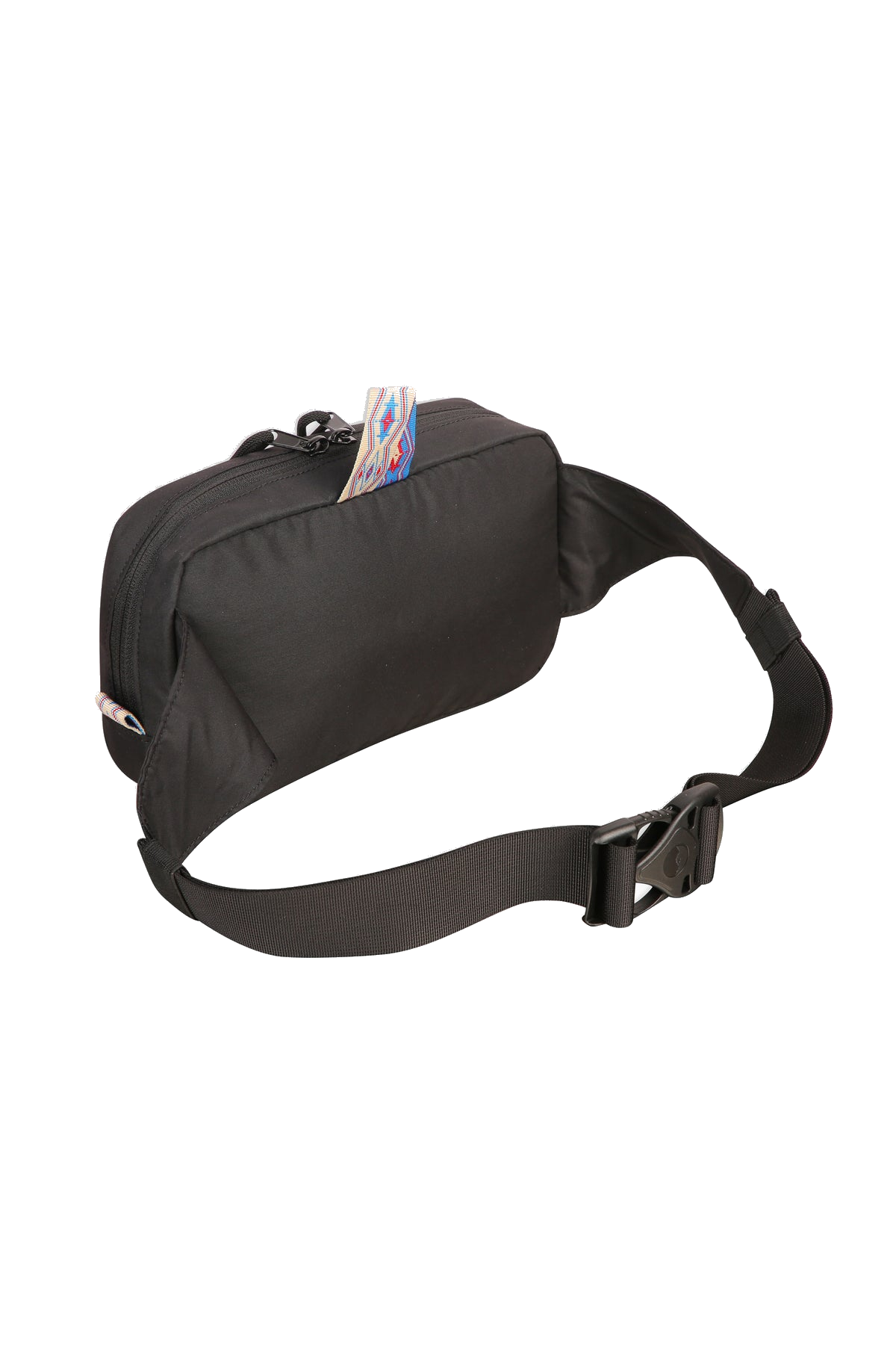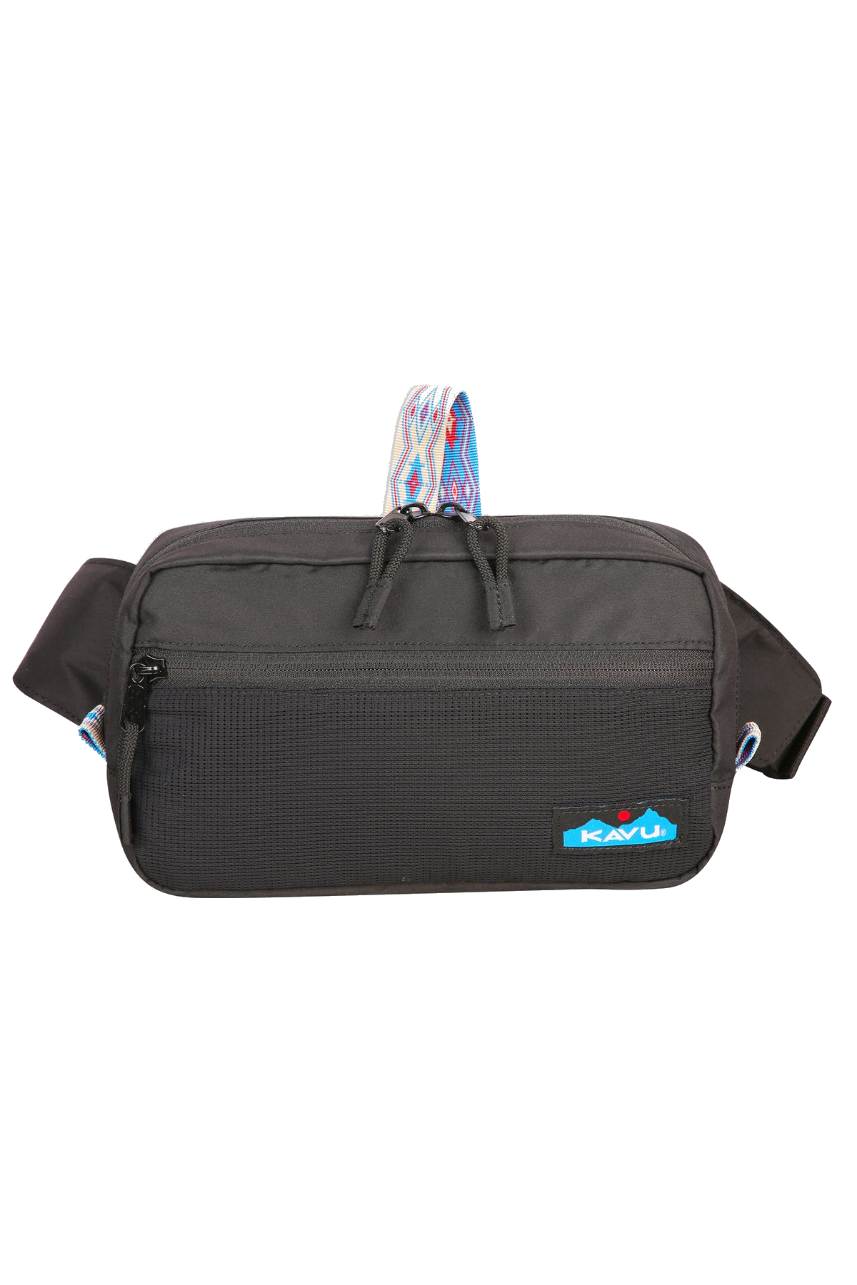 Belt bag / sling bag with adjustable straps and side release buckle, elastic webbing keeper at strap ends, pattern webbing locker loop tab at top, main compartment with two-way zip closure, front mesh zip pocket, internal zip pocket, rope loop zip pulls.