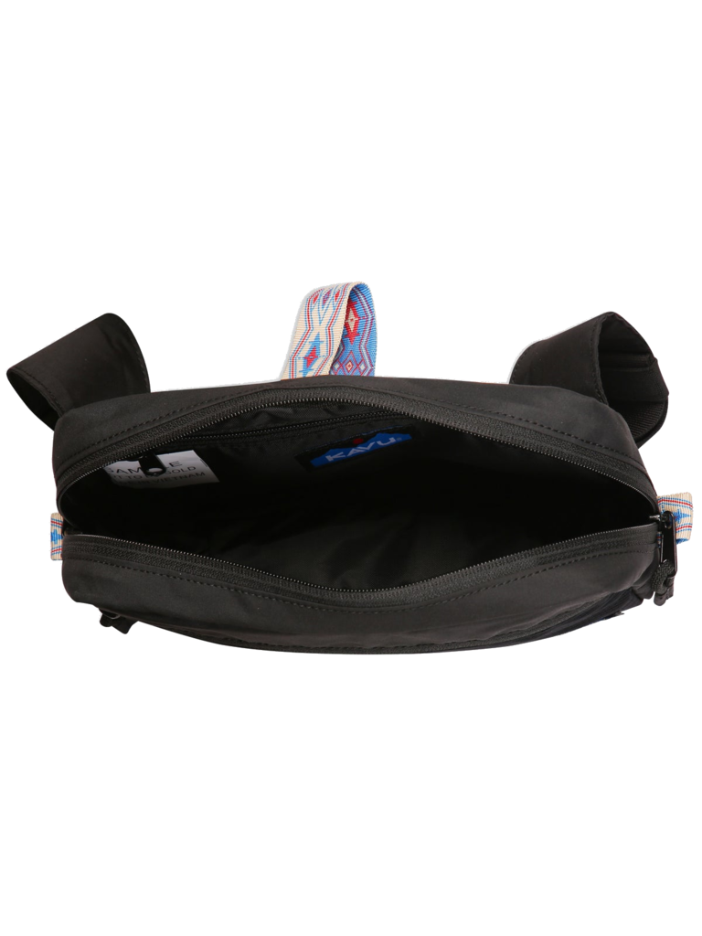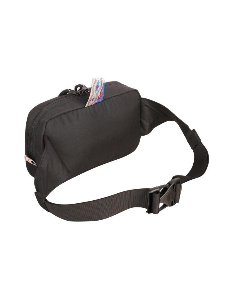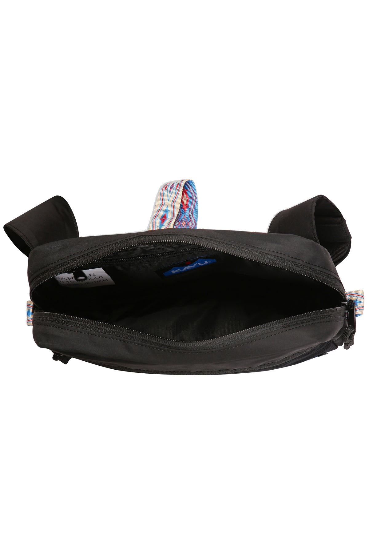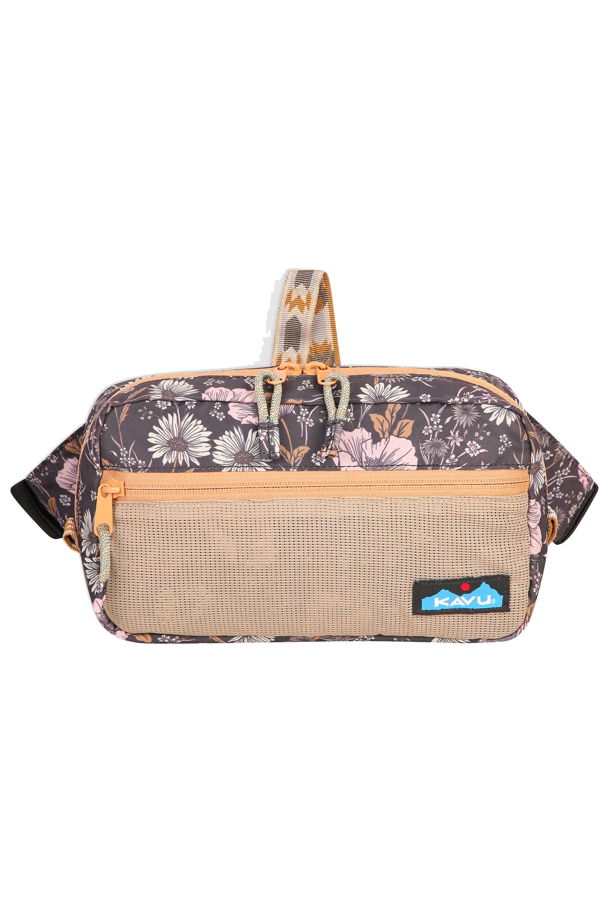 Belt bag / sling bag with adjustable straps and side release buckle, elastic webbing keeper at strap ends, pattern webbing locker loop tab at top, main compartment with two-way zip closure, front mesh zip pocket, internal zip pocket, rope loop zip pulls.