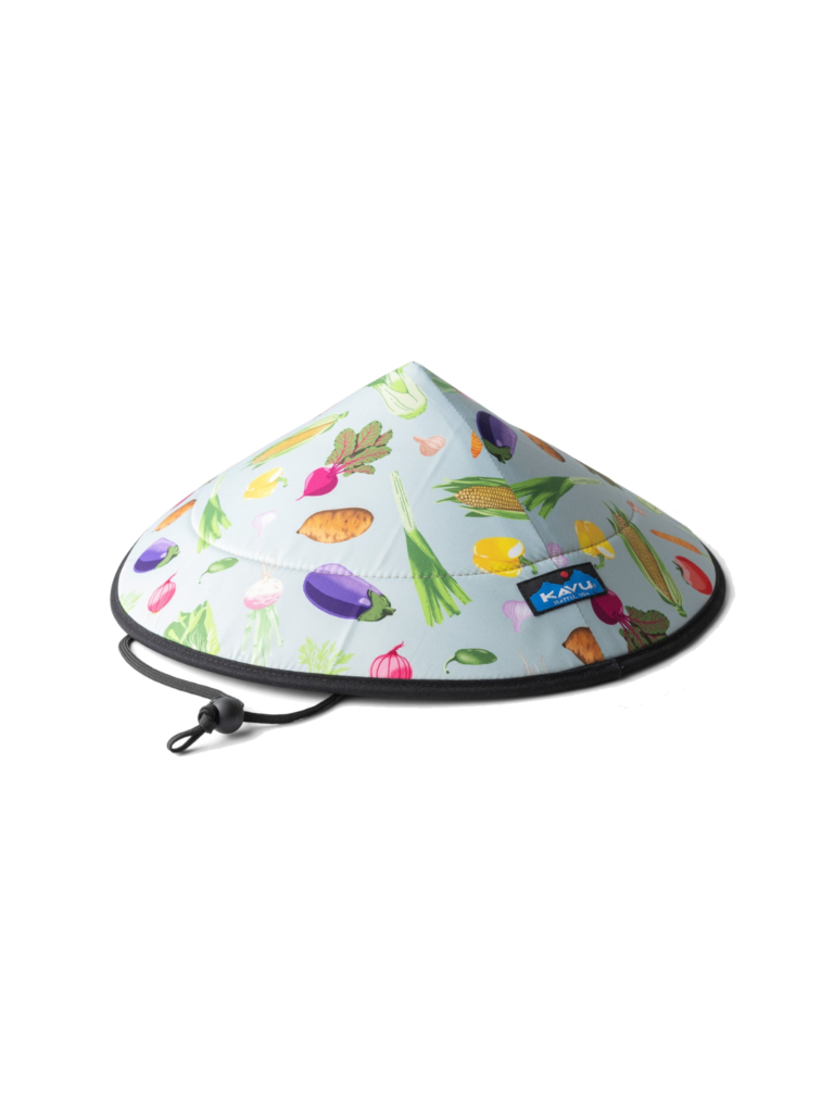 Semi padded circular shaped hat with toggle lock, quick-dry poly mesh headpiece, patterned nylon tubular webbing with KAVU adjustment.
