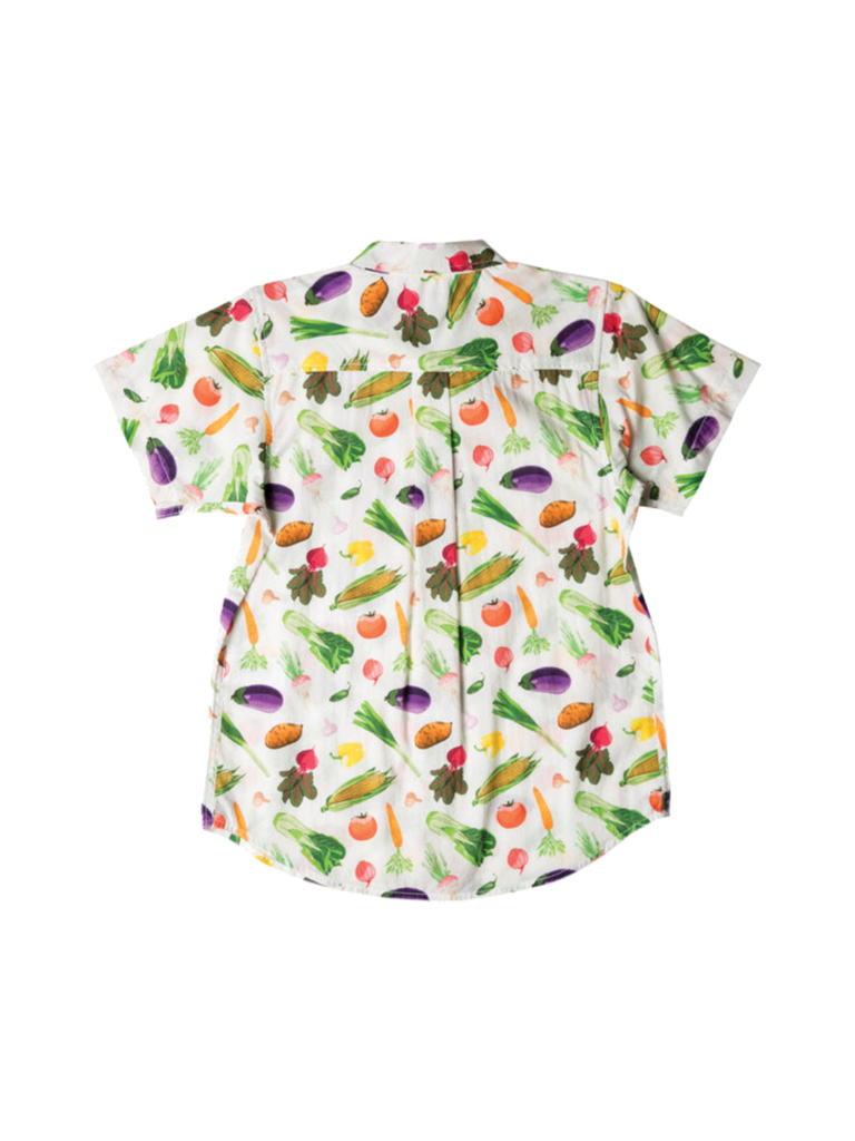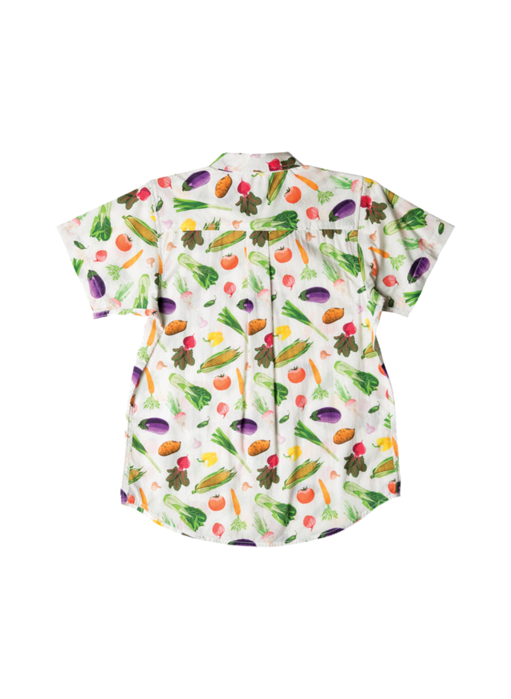 Boyfriend fit, short sleeve button up shirt, stand collar, one chest pocket, 25% certified recycled polyester matte buttons, curved hem.