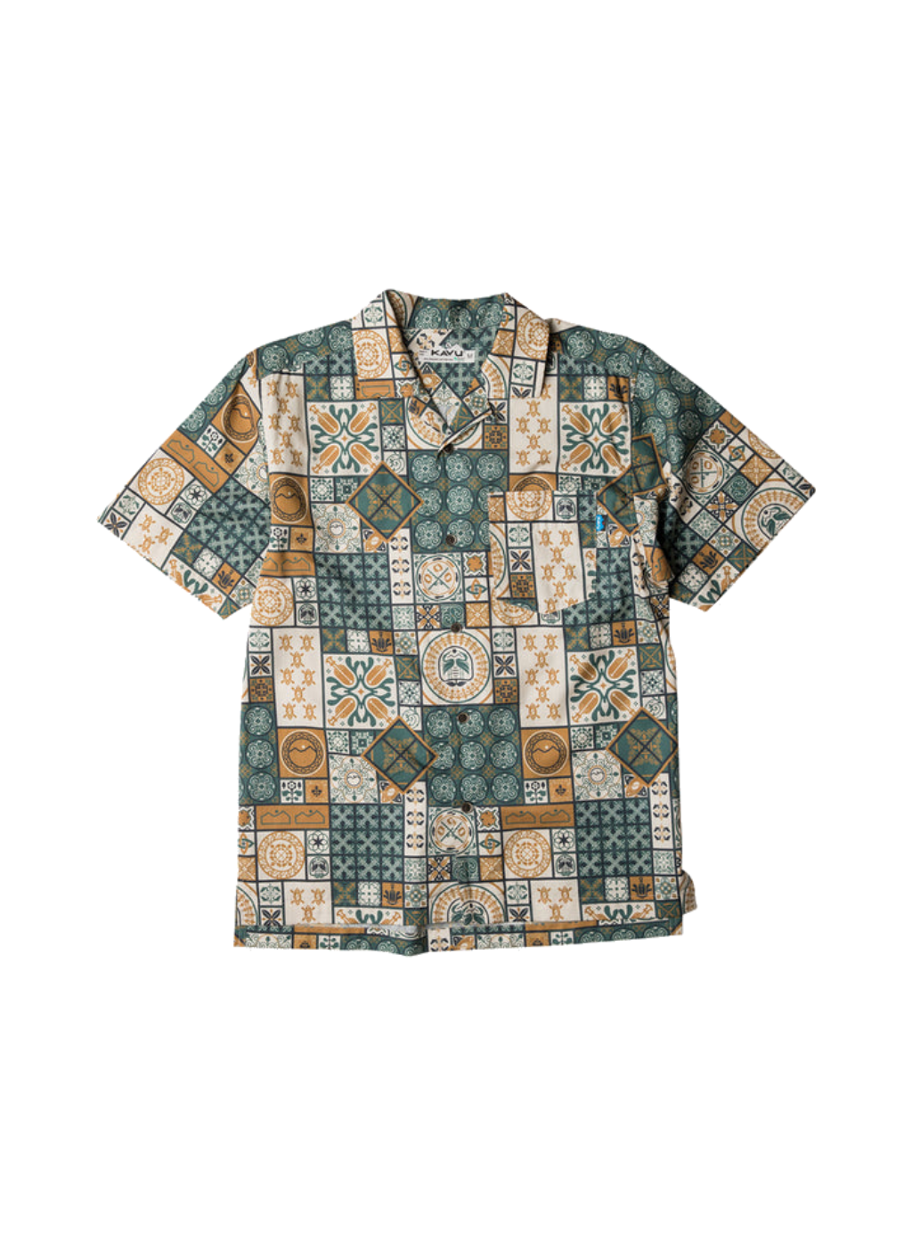 Casual fit, short sleeve button up shirt, fold over camp collar with button and loop closure, single chest pocket, 25% certified recycled polyester faux wood buttons, back bias cut yoke panel with center back box pleat, tennis tail drop back hem and side vents