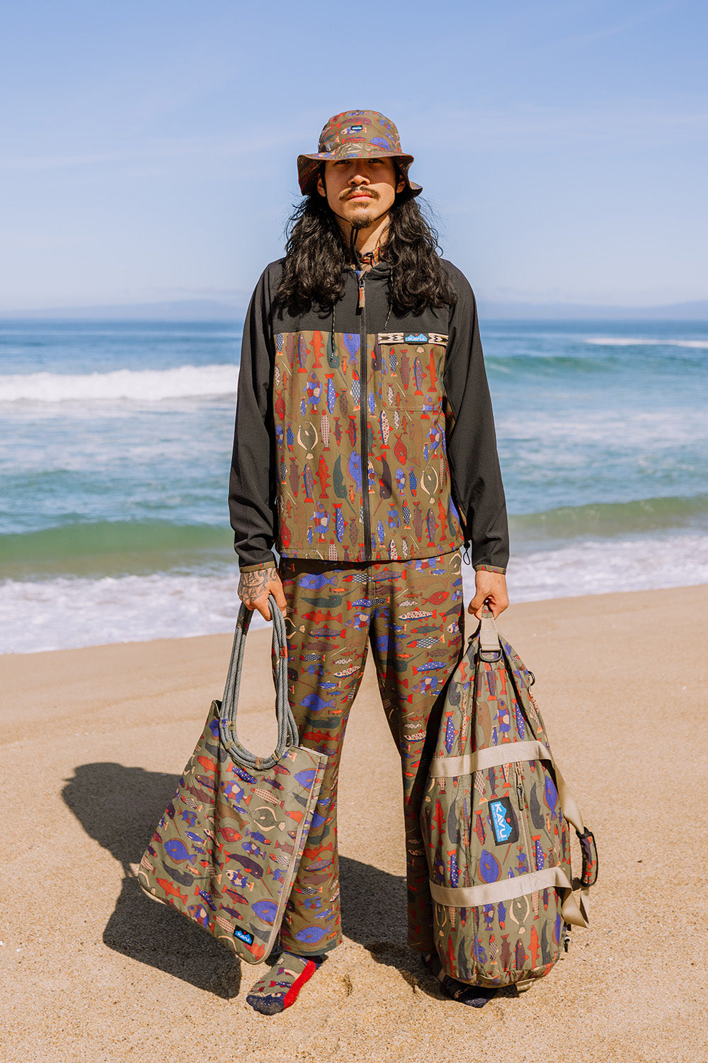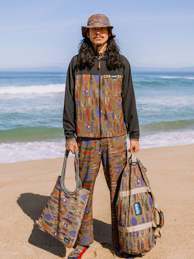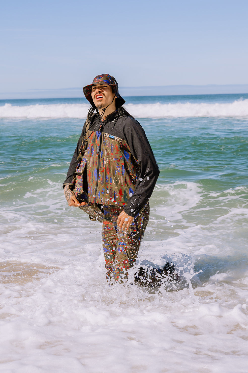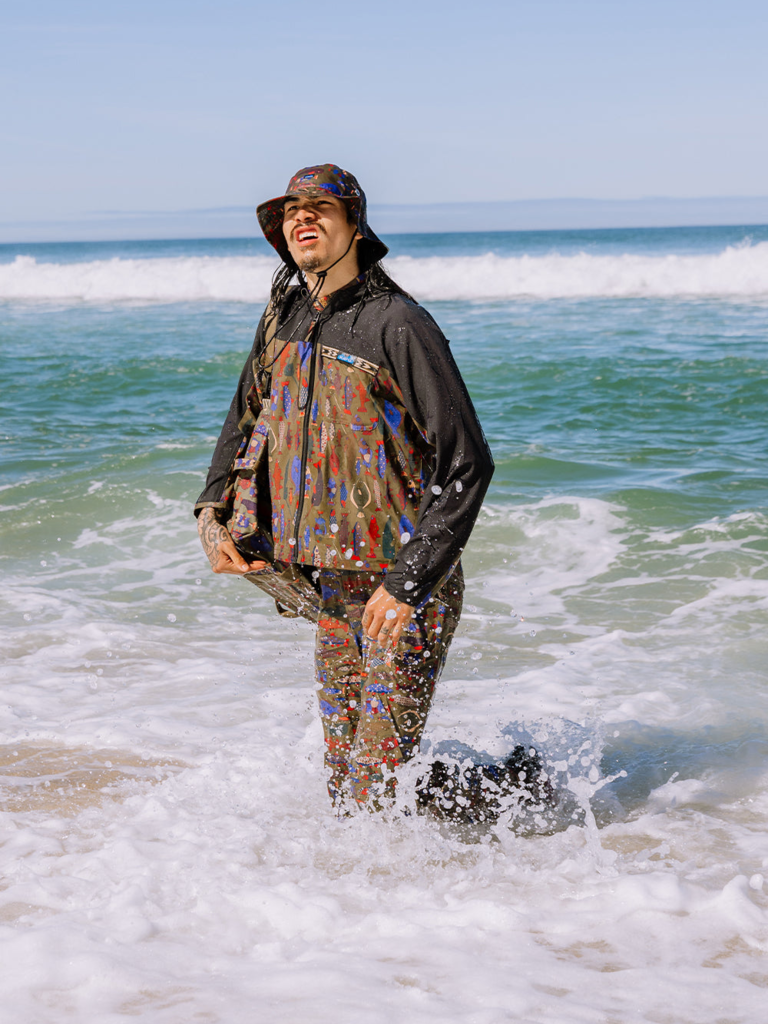Fabric: 5oz 92% polyester 8% spandex 2-way stretch woven - UPF 50+, quick dry - color blocked and digital printed.