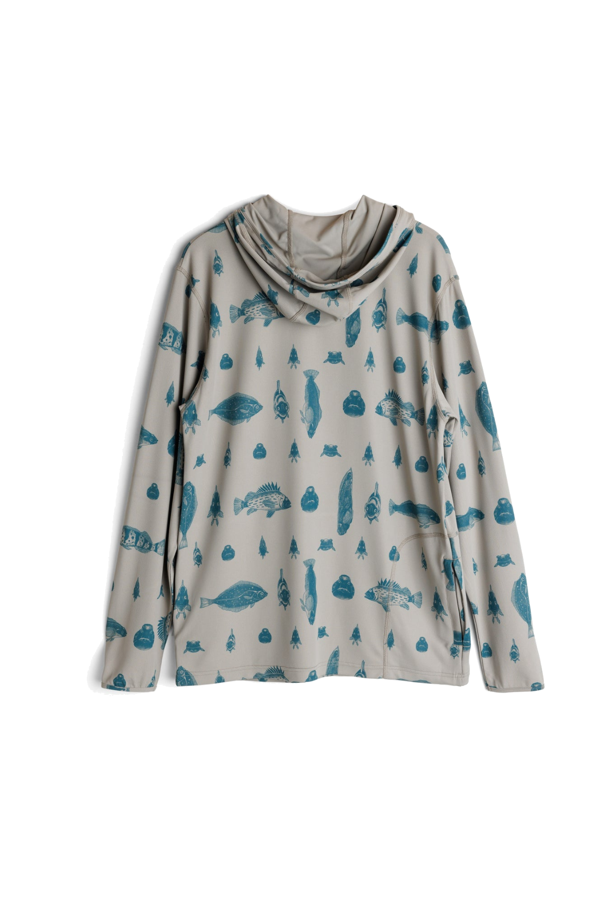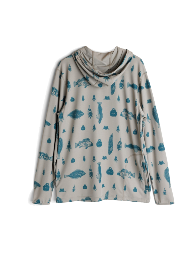 Casual fit, long sleeve hooded sun shirt, drawcord, pass through hand pocket, thumb loop at cuff, back security zip pocket, shirt is packable into back zip self-fabric pocket bag, straight hem, 4 needle flatlock stitch seams, transfer back neck label.