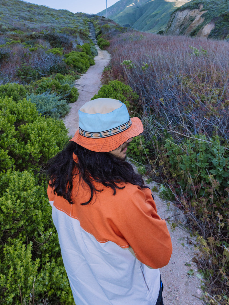 Organic cotton canvas bucket hat, adjustable chinstrap with cord lock, floppy brim, patterned nylon tubular webbing, interior moisture absorbing sweatband.
