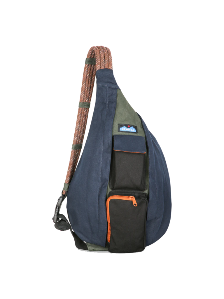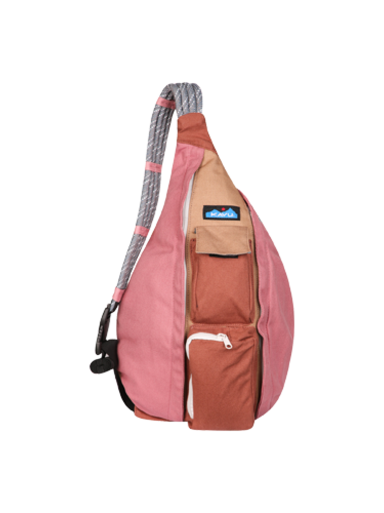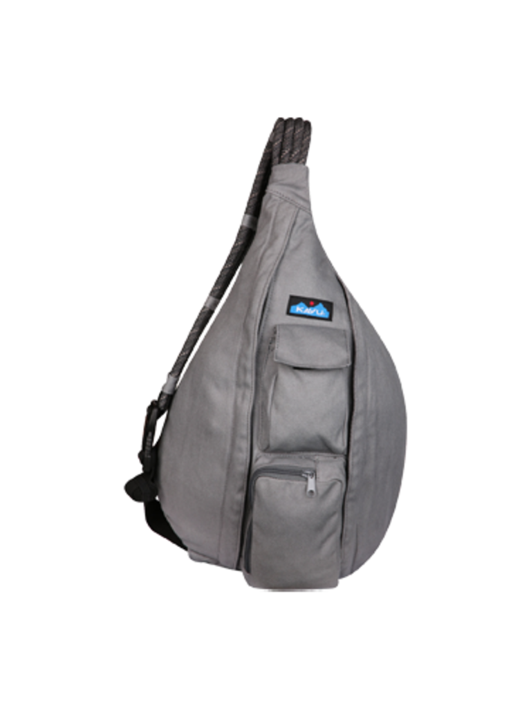 The Rope Bag features an adjustable rope shoulder strap, two vertical zip compartments, two key or cell phone pockets, and a padded back with KAVU embroidery.