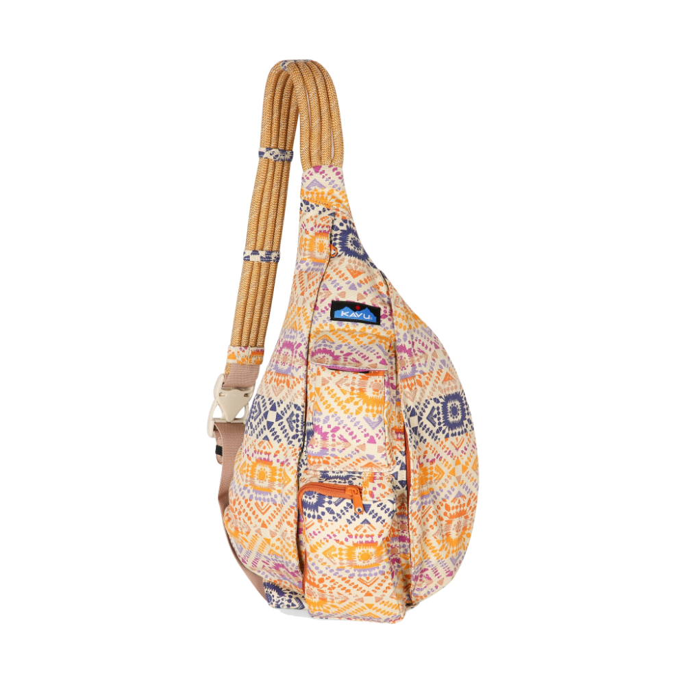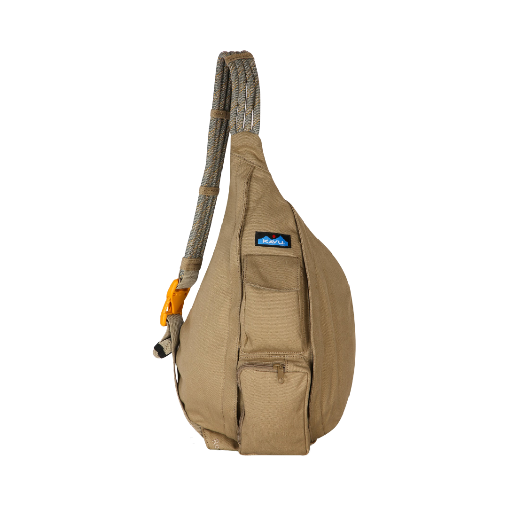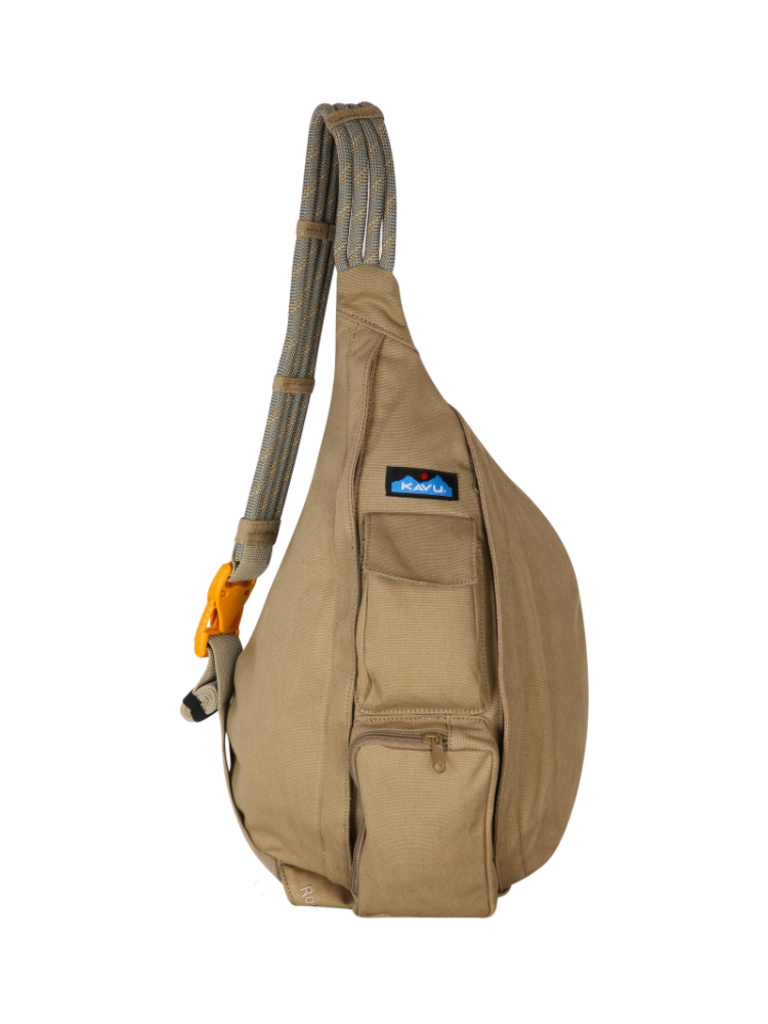 The Rope Bag features an adjustable rope shoulder strap, two vertical zip compartments, two key or cell phone pockets, and a padded back with KAVU embroidery.