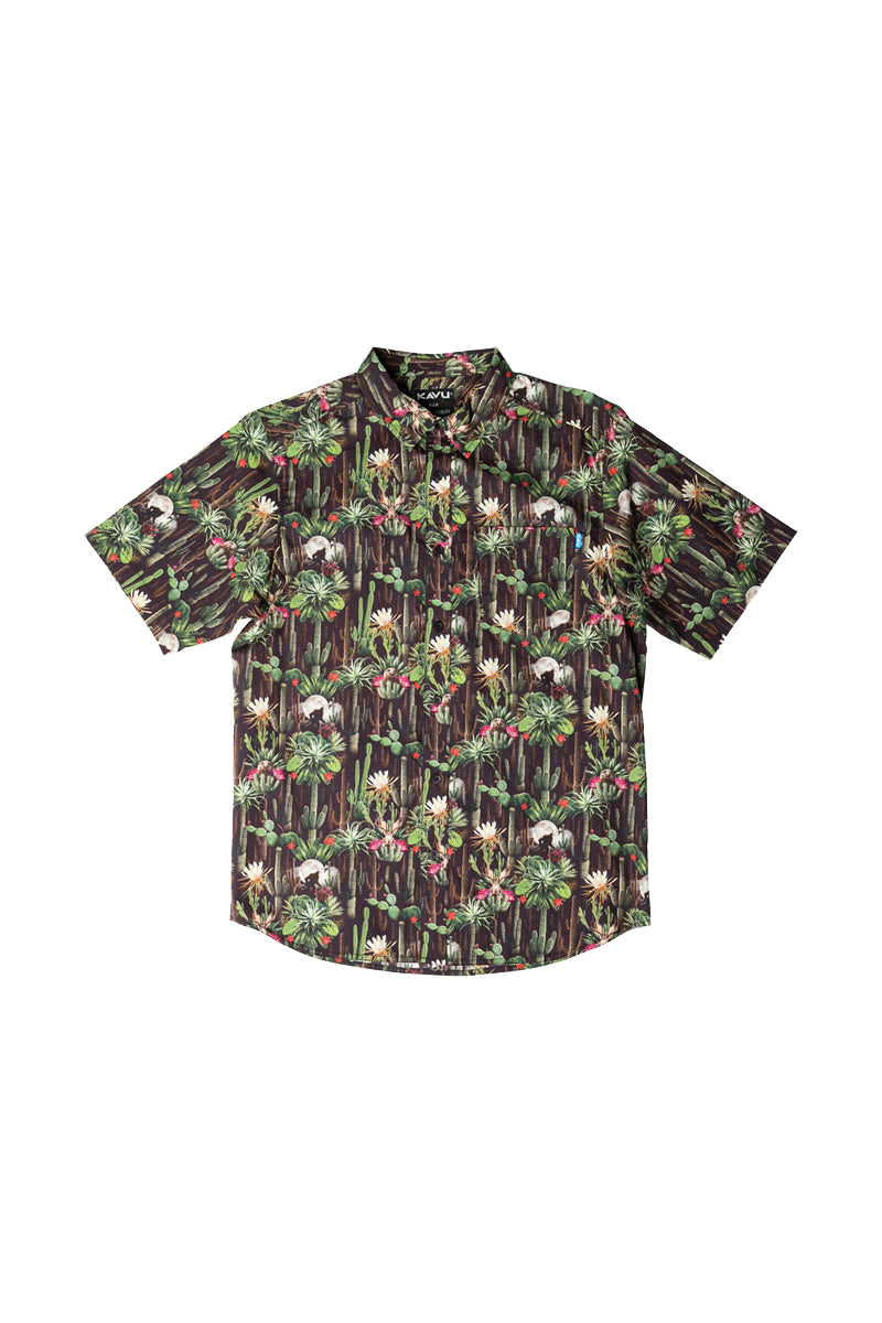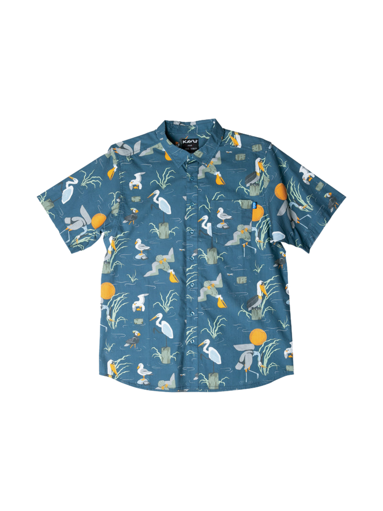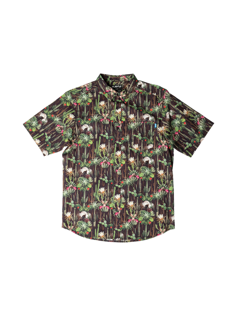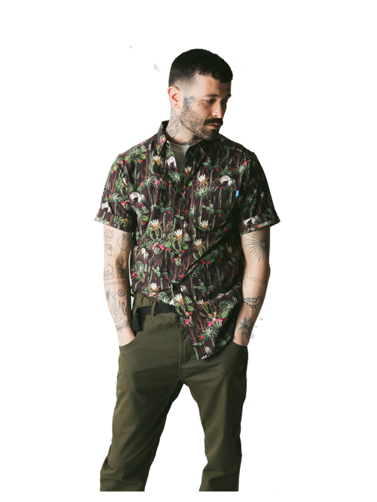 Casual fit, short sleeve button up shirt, stand collar, single chest pocket, dyed to match pearlized buttons with satin finish, back yoke panel with box pleat and locker loop, curved hem.
