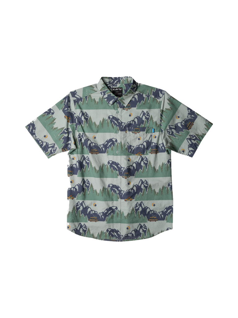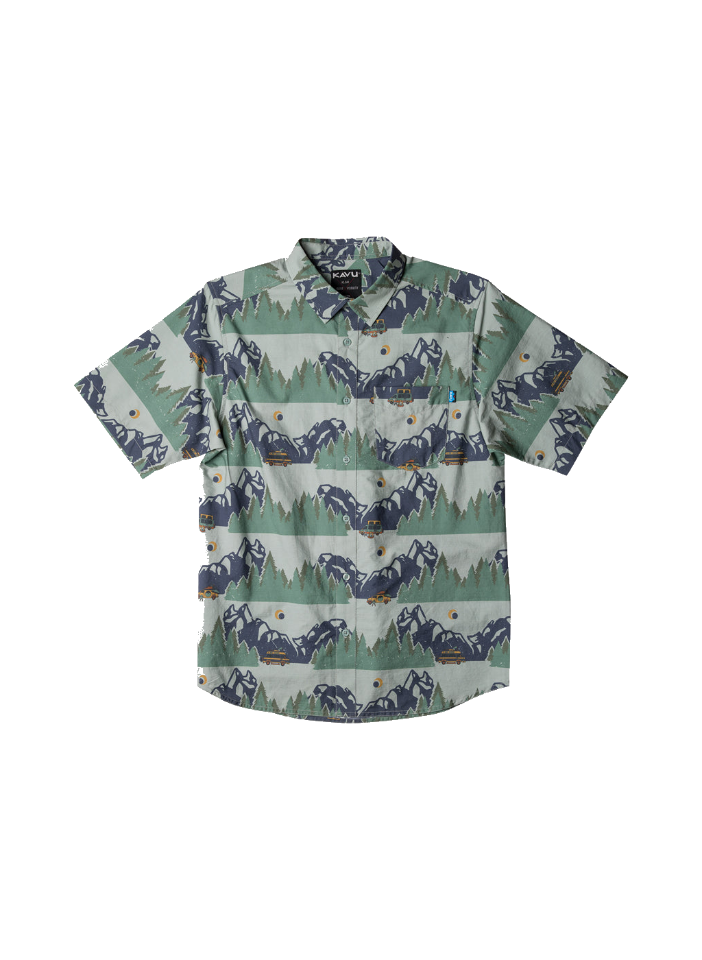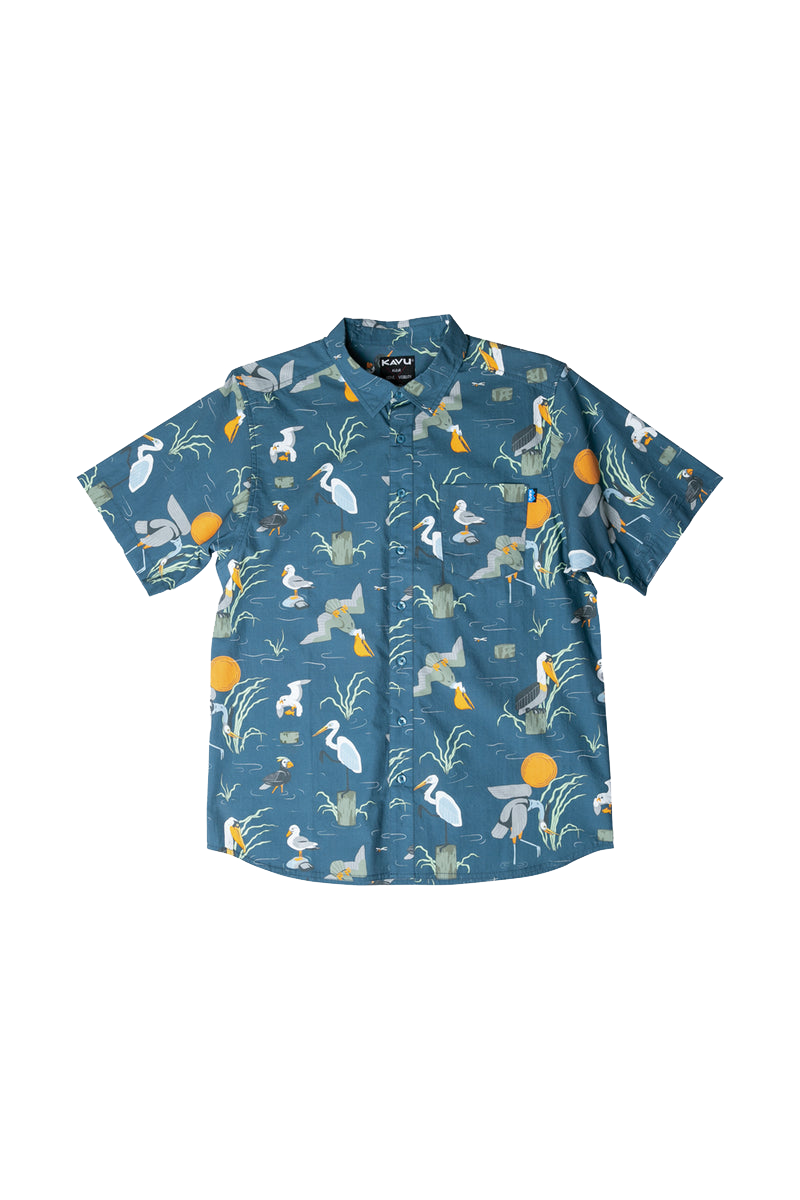 Casual fit, short sleeve button up shirt, stand collar, single chest pocket, dyed to match pearlized buttons with satin finish, back yoke panel with box pleat and locker loop, curved hem.