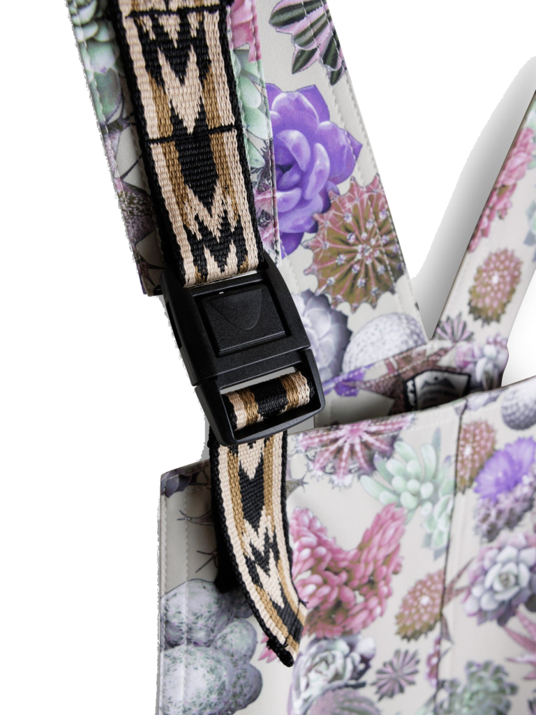 Easy, relaxed fit romper with adjustable webbing shoulder straps and buckle closure, two side patch pockets.