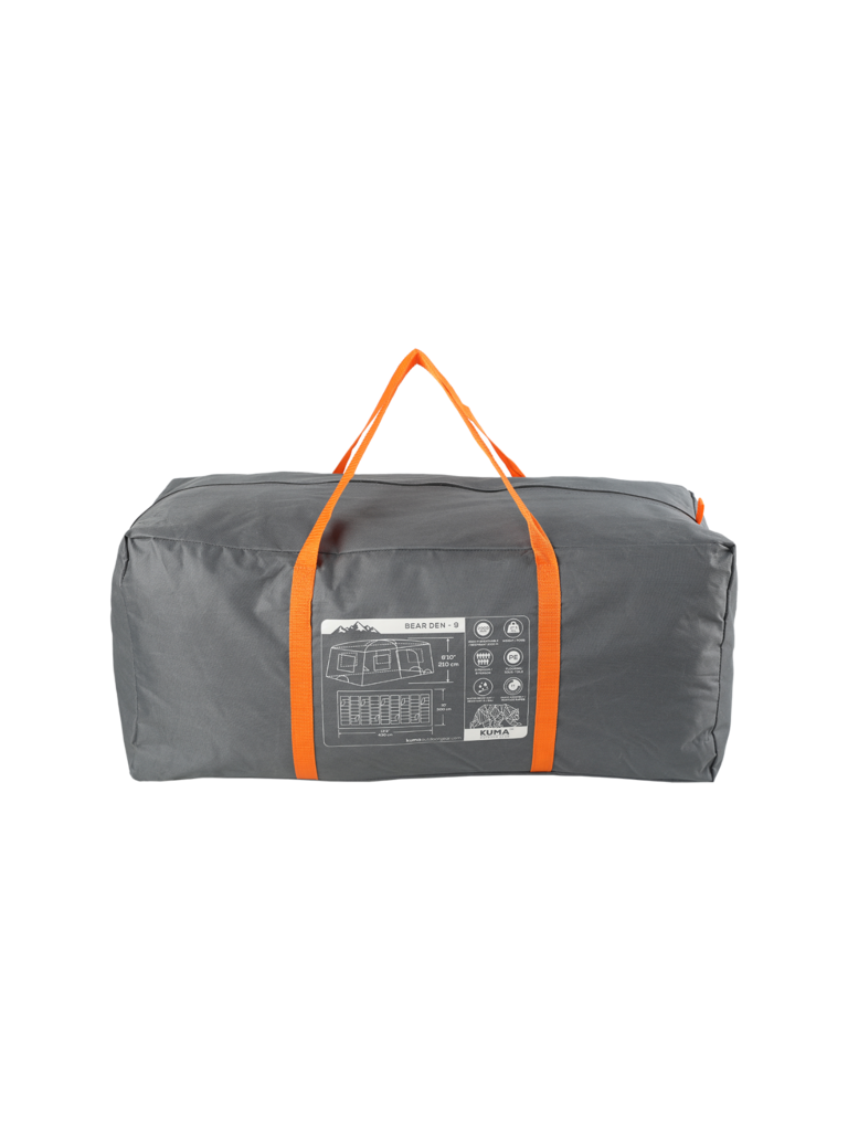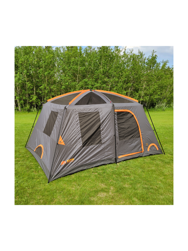 Create an accountThis massive 9 person tent is has ample space for a large family or a smaller family with some inside livable space or dry storage. It’s a simple set up and has fully taped fly seams. Built with 6 windows, 6 roof vents, 2 floor vents, one oversized man door and a special pet friendly door, you’ll have easy access in and out with exceptional air flow when needed. Comes complete with a removable inside wall divider, with full center zipper, providing the opportunity to create separate spaces as you see fit.