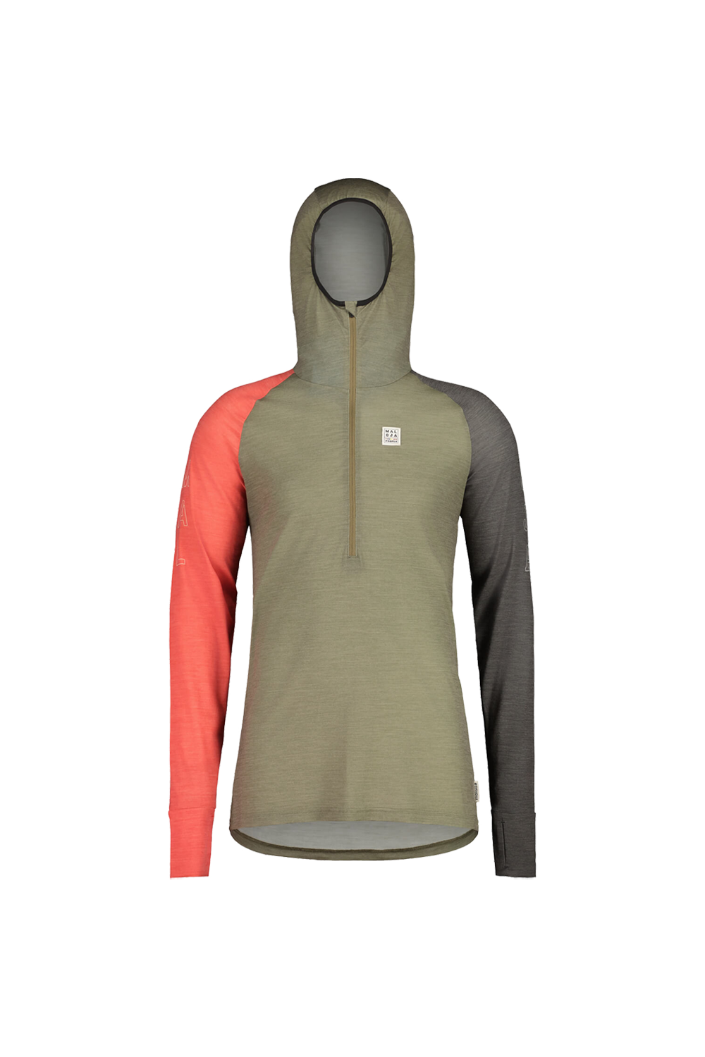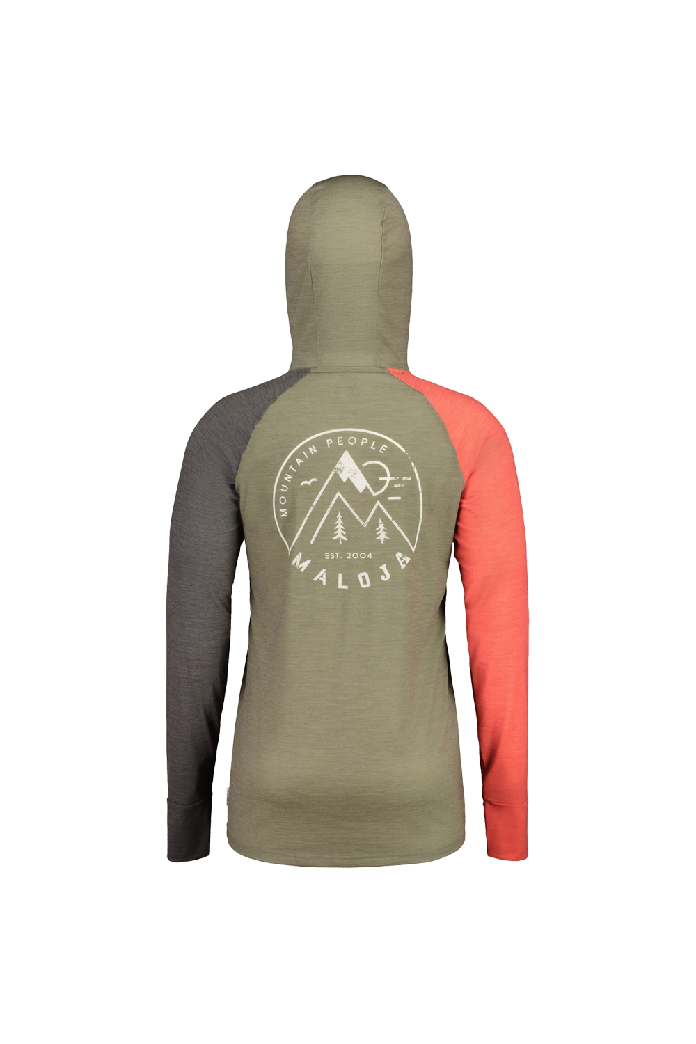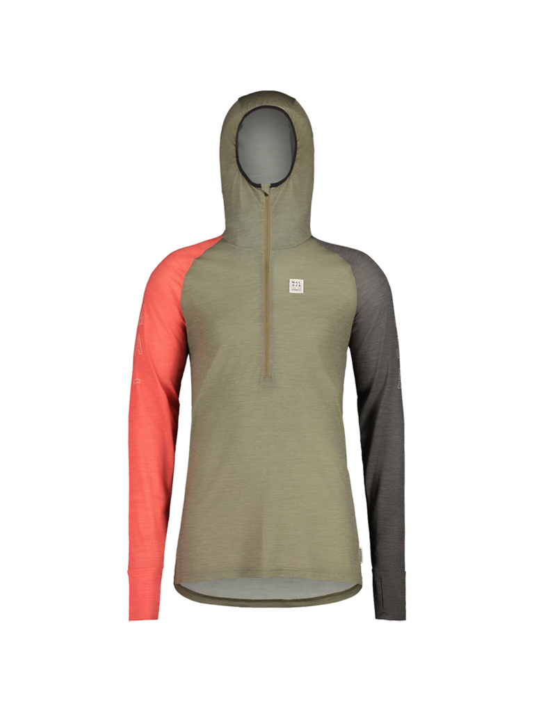 The multisport shirt is made of Meridry. The material is very light, extremely breathable and always feels comfortable. The hood can be worn under the helmet when climbing or biking, the thumbholes ensure that the sleeves do not slip back. A real multi-sport product for every day. Large mountain print on the back, split Maloja lettering on the upper arms, Mountain People label on the chest.